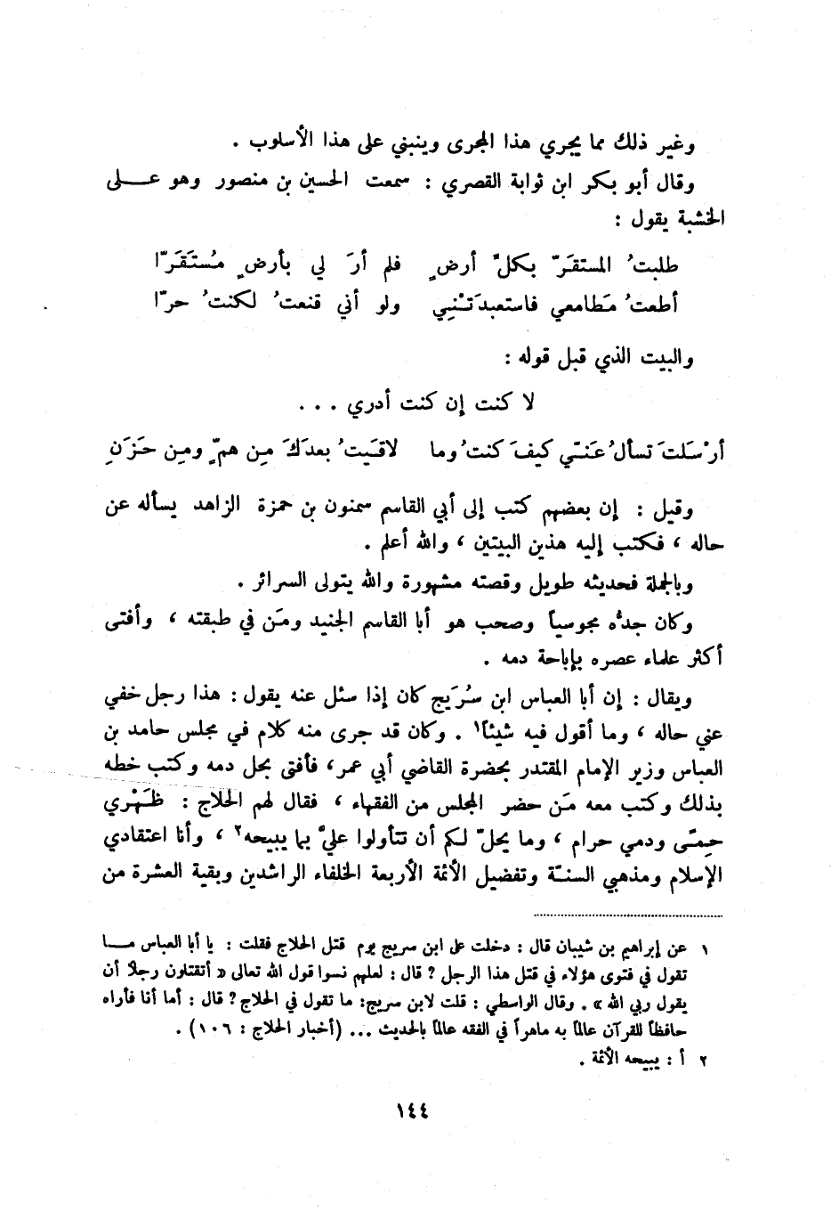 (1) عن إبراهيم بن شيبان قال: دخلت على ابن سريج يوم قتل الحلاج فقلت: يا أبا العباس ما تقول في فتوى هؤلاء في قتل هذا الرجل قال: لعلهم نسوا قول الله تعالى " أتقتلون رجلا أن يقول ربي الله ". وقال الواسطي: قلت لابن سريج: ما تقول في الحلاج قال: أما أنا فأراه حافظا للقرآن عالما به ماهرا في الفقه عالما بالحديث ... (أخبار الحلاج: 106) .