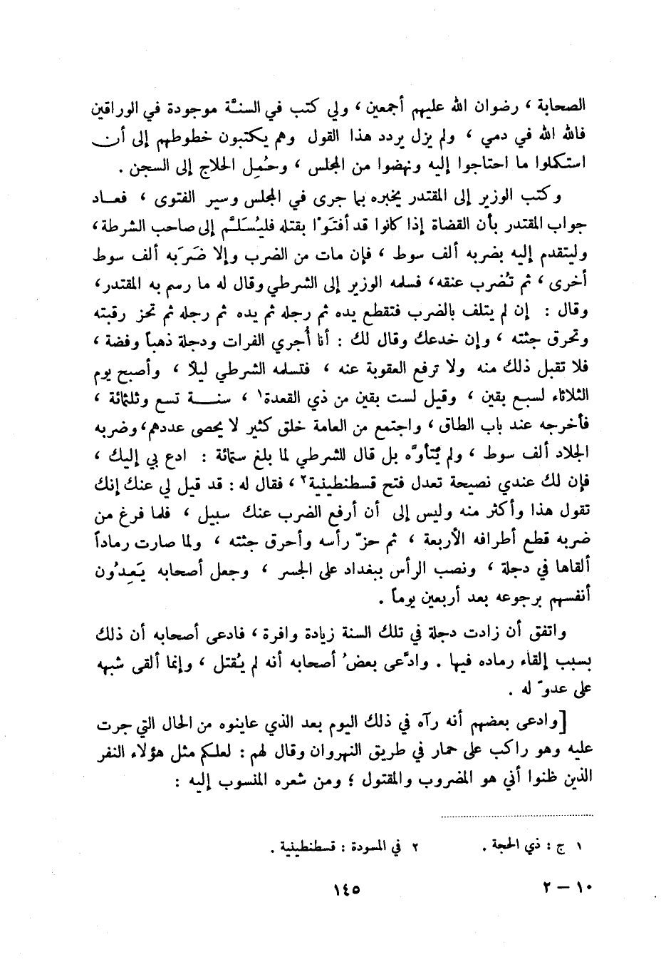 وكتب الوزير إلى المقتدر يخبره بما جرى في المجلس وسير الفتوى، فعاد جواب المقتدر بأن القضاة إذا كانوا قد أفتوا بقتله فليسلم إلى صاحب الشرطة، وليتقدم إليه بضربه ألف سوط، فإن مات من الضرب وإلا ضربه ألف سوط أخرى؛ ثم تضرب عنقه، فسلمه الوزير إلى الشرطي وقال له ما رسم به المقتدر، وقال: إن لم يتلف بالضرب فتقطع يده ثم رجله ثم يده ثم رجله ثم تحز رقبته وتحرق جثته، وإن خدعك وقال لك: أنا أجري الفرات ودجلة ذهباً وفضة، فلا تقبل ذلك منه ولا ترفع العقوبة عنه، فتسلمه الشرطي ليلاً، وأصبح يوم الثلاثاء لسبع بقين، وقيل لست بقين من ذي القعدة (1) ، سنة تسع وثلثمائة، فأخرجه عند باب الطاق، واجتمع من العامة خلق كثير لا يحصى عددهم، وضربه الجلاد ألف سوط، ولم يتأوه بل قال للشرطي لما بلغ ستمائة: ادع بي إليك، فإن لك عندي نصيحة تعدل فتح قسطنطينية (2) ، فقال له: قد قيل لي عنك إنك تقول هذا واكثر منه وليس إلى أن أرفع الضرب عنك سبيل، فلما فرغ ضربه قطع أطرافه الأربعة، ثم حز رأسه وأحرق جثته، ولما صارت رماداً ألقاها في دجلة، ونصب الرأس ببغداد على الجسر، وجعل أصحابه يعدون أنفسهم برجوعه بعد أربعين يوماً.