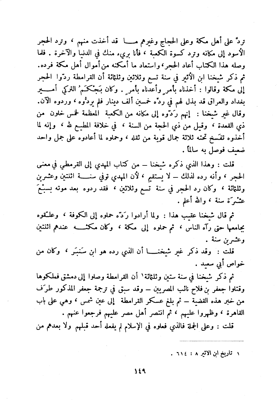 قلت: وهذا الذي ذكره شيخنا - من كتاب المهدي إلى القرمطي في معنى الحجر، وأنه رده لذلك - لا يستقيم، لأن المهدي توفي سنة اثنتين وعشرين وثلثمائة، وكان رد الحجر في سنة تسع وثلاثين، فقد ردوه بعد موته بسبع عشرة سنة، والله أعلم.