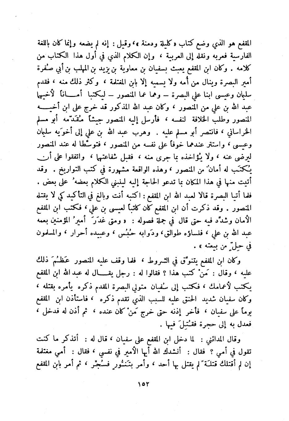 المقفع هو الذي وضع كتاب " كليلة ودمنة "، وقيل: إنه لم يضعه وإنما كان باللغة الفارسية فعربه ونقله إلى العربية، وإن الكلام الذي في أول هذا الكتاب من كلامه. وكان ابن المقفع يعبث بسفيان بن معاوية بن يزيد بن المهلب بن أبي صفرة أمير البصرة وينال من أمه ولا يسميه إلا بابن المغتلمة، وكثر ذلك منه، فقدم سليمان وعيسى ابنا علي البصرة - وهما عما المنصور - ليكتبا أماناً لأخيهما عبد الله بن علي من المصور، وكان عبد الله المذكور قد خرج على ابن أخيه المنصور وطلب الخلافة لنفسه، فأرسل إليه المنصور جيشاً مقدمه أبو مسلم الخراساني، فانتصر أبو مسلم عليه. وهرب عبد الله بن علي إلى أخويه سليمان وعيسى، واستتر عندهما خوفاً على نفسه من المنصور، فتوسطا له عند المنصور ليرضى عنه، ولا يؤاخذه بما جرى منه، فقبل شفاعتهما، واتفقوا على أن يكتب له أمان من المنصور، وهذه الواقعة مشهورة في كتب التواريخ. وقد أتيت منها في هذا المكان بما تدعو الحاجة إليه لينبني الكلام بعضه على بعض. فلما أتيا البصرة قالا لعبد الله ابن المقفع: اكتبه أنت وبالغ في التأكيد كي لا يقتله المنصور. وقد ذكرت أن ابن المقفع كان كاتباً لعيسى بن علي، فكتب ابن المقفع الأمان وشدد فيه حتى قال في جملة فصوله: " ومتى غدر أمير المؤمنين بعمه عبد الله بن علي، فتساؤه طوالق، ودوابه حبس، وعبيده أحرار، والمسلمون في حل من بيعته ".