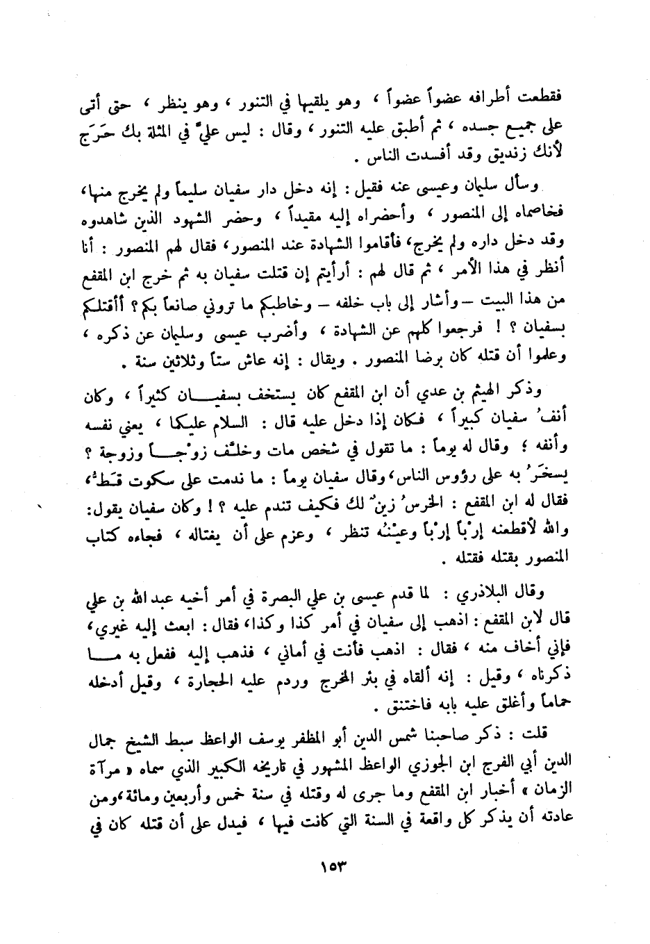قلت: ذكر صاحبنا شمس الدين أبو المظفر يوسف الواعظ سبط الشيخ جمال الدين أبي الفرج ابن الجوزي الواعظ المشهور في تاريخه الكبير الذي سماه " مرآة الزمان " أخبار ابن المقفع وما جرى له وقتله في سنة خمس وأربعين ومائة، ومن عادته أن يذكر كل واقعة في السنة التي كانت فيها، فيدل على أن قتله كان في
