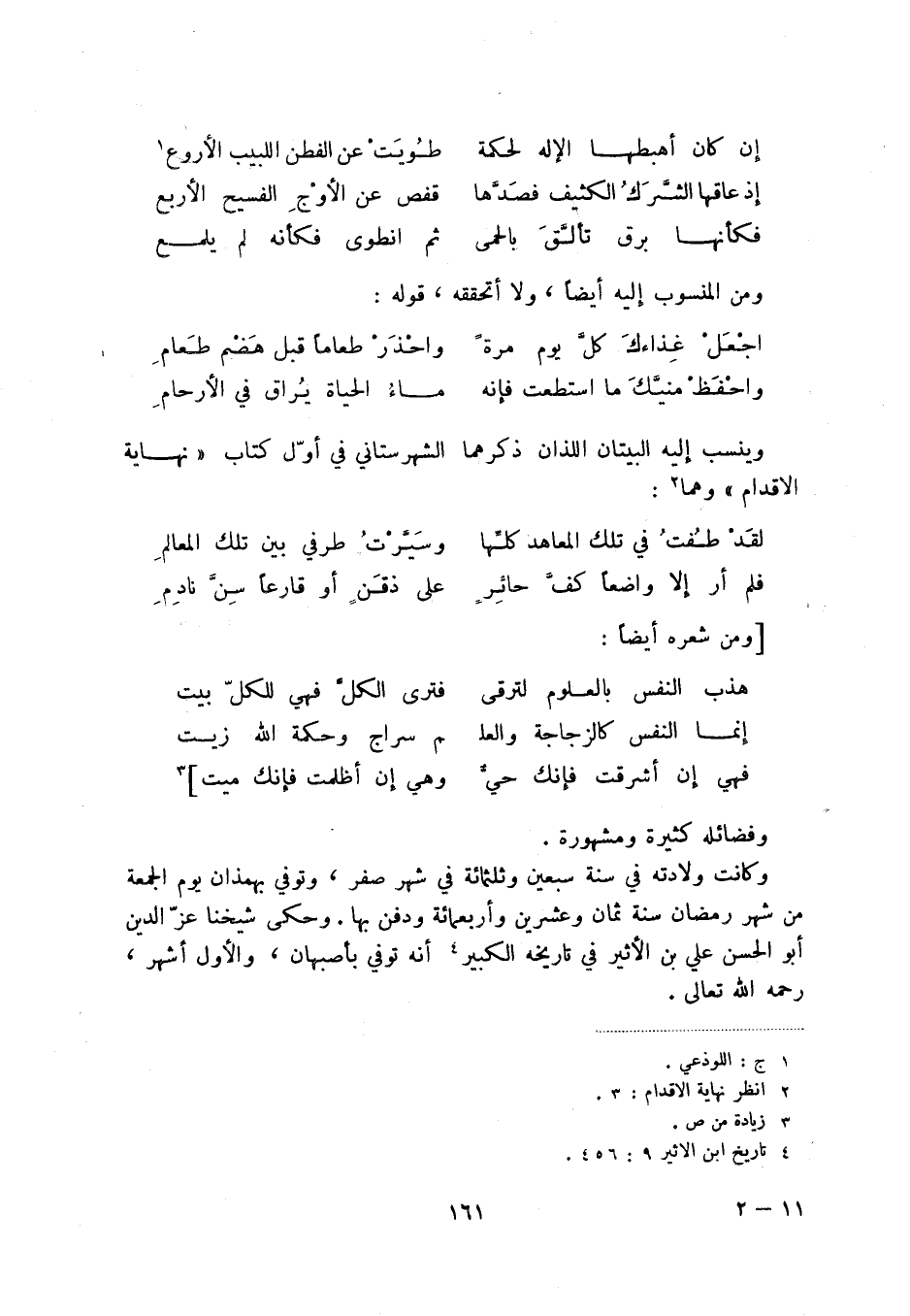 واحفظ منيك ما استطعت فإنه ... ماء الحياة يراق في الأرحام وينسب إليه البيتان اللذان ذكرهما الشهرستان في أول كتاب " نهاية الأقدام " وهما (2) :