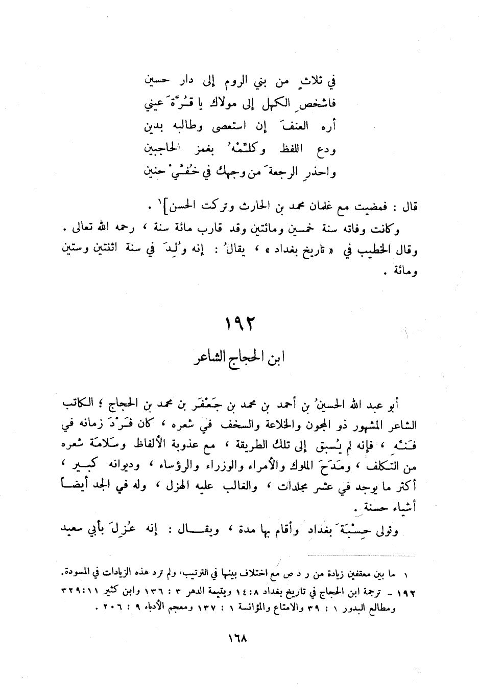 (2) ترجمة ابن الحجاج في تاريخ بغداد 8: 14 ويتيمة الدهر 3: 136 وابن كثير 11: 329 ومطالع البدور 1: 39 والامتاع والمؤانسة 1: 137 ومعجم الأدباء 9: 206.