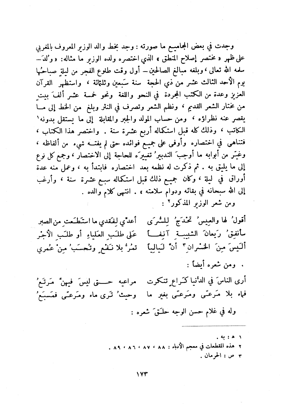 وجدت في بعض المجاميع ما صورته: وجد بخط والد الوزير المعروف بالمغربي على ظهر " مختصر إصلاح المنطق " الذي اختصره ولده الوزير ما مثاله: " ولد - سلمه الله تعالى، وبلغه مبالغ الصالحين - أول وقت طلوع الفجر من ليلة صباحها يوم الأحد الثالث عشر من ذي الحجة سنة سبعين وثلثمائة، واستظهر القرآن العزيز وعدة من الكتب المجردة في النحو واللغة ونحو خمسة عشر ألف بيت من مختار الشعر القديم، ونظم الشعر وتصرف في النثر وبلغ من الخط إلى ما يقصر عن نظراؤه، ومن حساب المولد والجبر والمقابلة إلى ما يستقل بدونه (1) الكاتب، وذلك كله قبل استكماله أربع عشرة سنة. واختصر هذا الكتاب، فتناهى في اختصاره وأوفى على جميع فوائده حتى لم يفته شيء من ألفاظه، وغير من أبوابه ما أوجب التدبير تغييره للحاجة إلى الاختصار، وجمع كل نوع إلى ما يليق به. ثم ذكرت له نظمه بعد اختصاره فابتدأ به، وعمل منه عدة أوراق في ليلة، وكان جميع ذلك قبل استكماله سبع عشرة سنة، وأرغب إلى الله سبحانه في بقائه ودوام سلامته ". انتهى كلام والده.