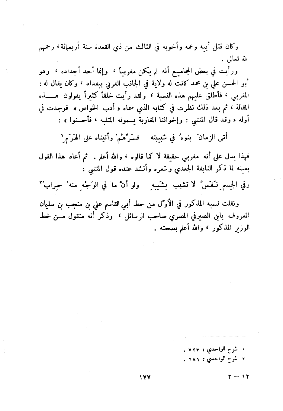 ورأيت في بغض المجاميع أنه لم يكن مغربياً، وإنما أحد أجداده، وهو أبو الحسن علي بن محمد كانت له ولاية في الجانب الغربي ببغداد، وكان يقال له: المغربي، فأطلق عليهم هذه النسبة، ولقد رأيت خلقاً كثيراً يقولون هذه المقالة، ثم بعد ذلك نظرت في كتابه الذي سماه " أدب الخواص " فوجدت في أوله " وقد قال المتنبي: وإخواننا المغاربة يسمونه المتنبه، فأحسنوا ":
