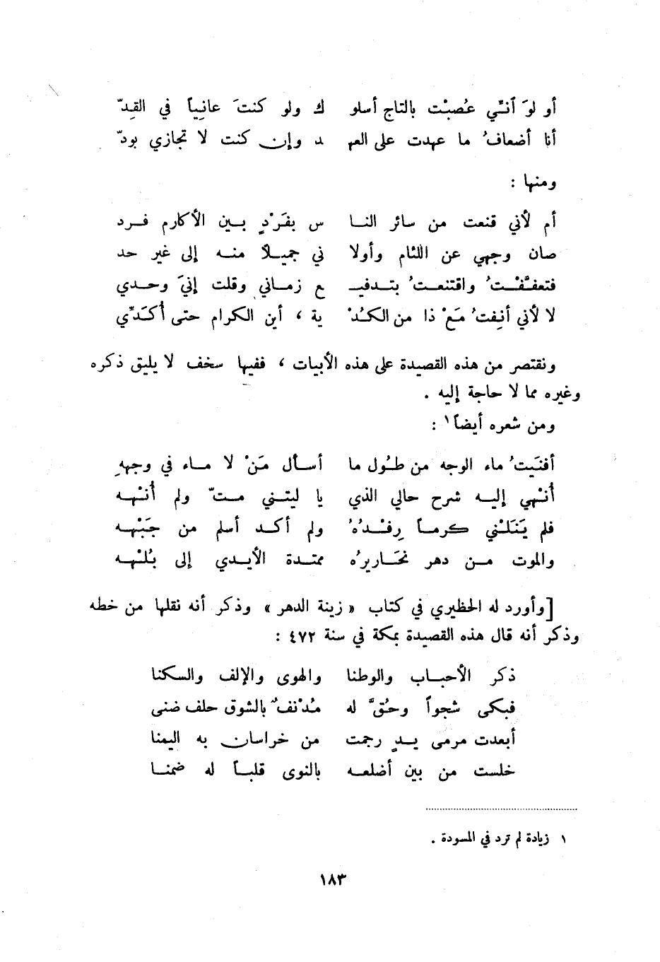 والموت من دهر نحاريره ... ممتدة الأيدي إلى بلهه [وأورد له الحظيري في كتاب " زينة الدهر " وذكر أنه نقلها من خطه وذكر أنه قال هذه القصيدة بمكة في سنة 472: