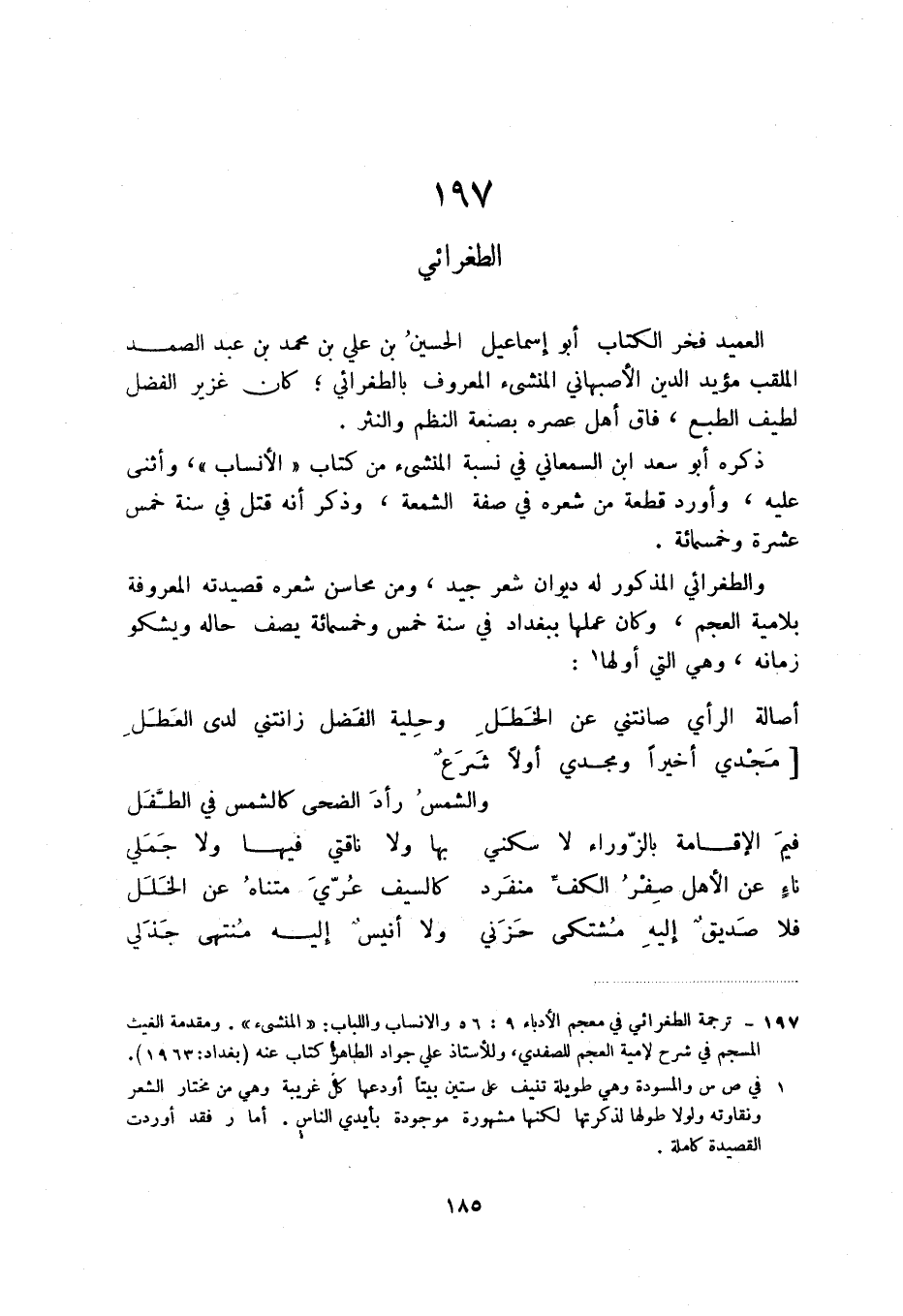 (1) ترجمة الطغرائي في معجم الأدباء 9: 56 والأنساب واللباب: " المنشئ ". ومقدمة الغيث المسجم في شرح لأمية العجم للصفدي، وللأستاذ علي جواد الطاهر كتاب عنه (بغداد: 1963) .