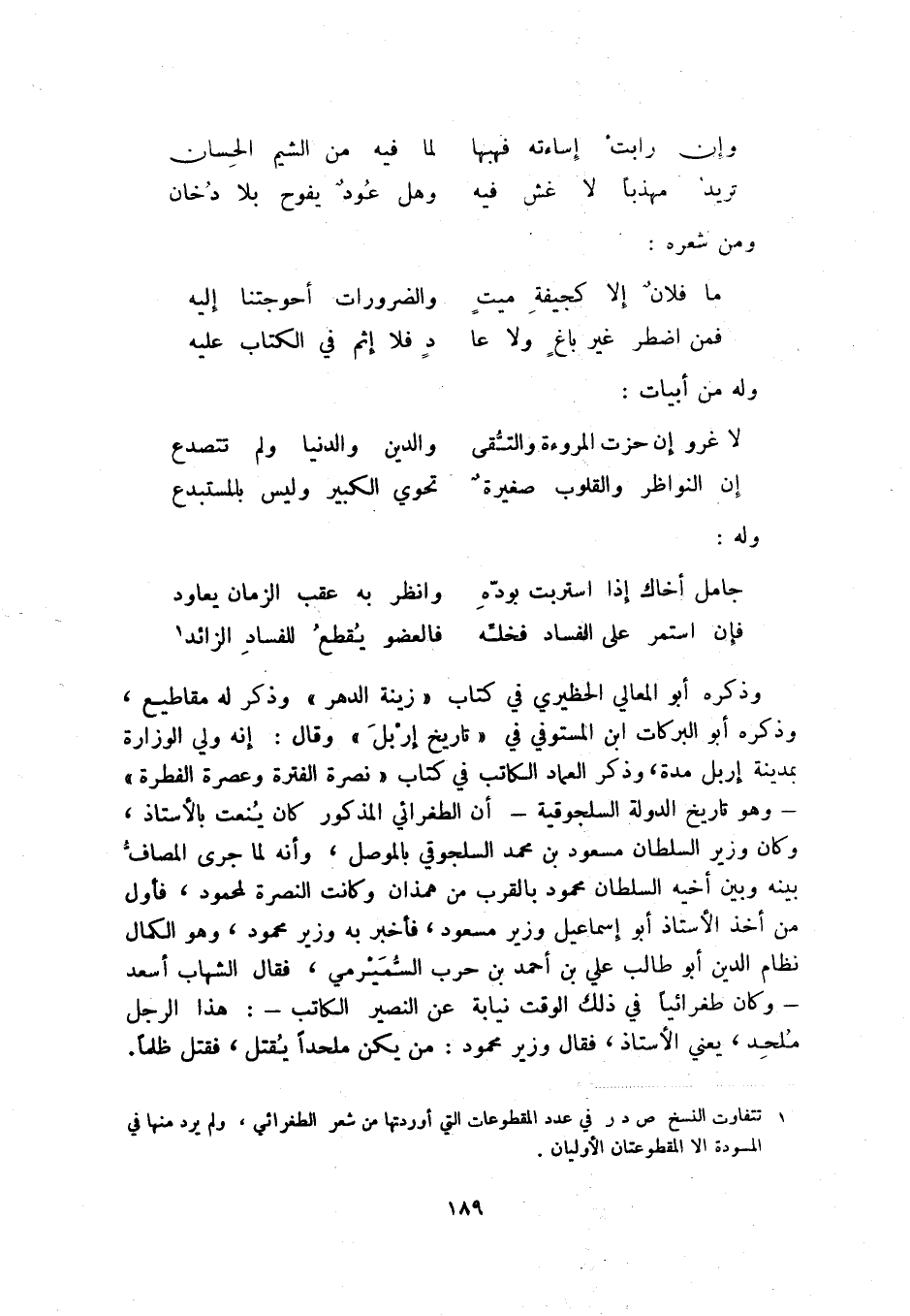 (1) تتفاوت النسخ ص د ر في عدد المقطوعات التي أوردتها من شعر الطغرائي، ولم يرد منها في المسودة إلا المقطوعتان الأوليان.