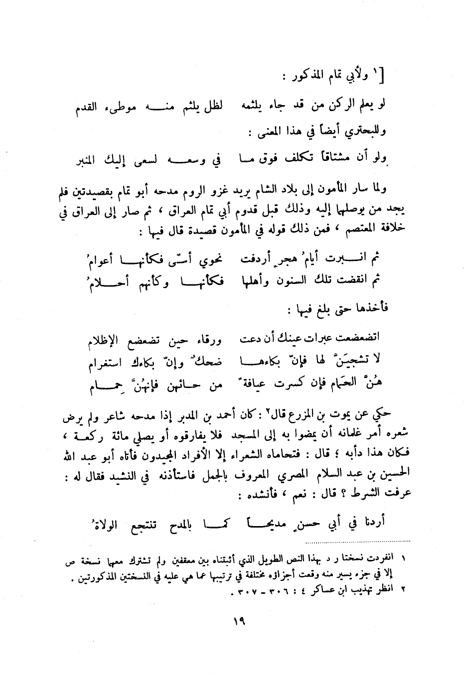 هن الحمام فإن كسرت عيافة ... من حائهن فإنهن حمام حكي عن يموت بن المزرع قال (2) : كان أحمد بن المدبر إذا مدحه شاعر ولم يرض شعره أمر غلمانه أن يمضوا به إلى المسجد فلا يفارقوه أو يصلي مائة ركعة، فكان هذا دأبه؛ قال: فتحاماه الشعراء غلا الأفراد المجيدون فأتاه أبو عبد الله الحسين بن عبد السلام المصري المعروف بالجعل فاستأذنه في النشيد فقال له: عرفت الشرط قال: نعم، فأنشده: