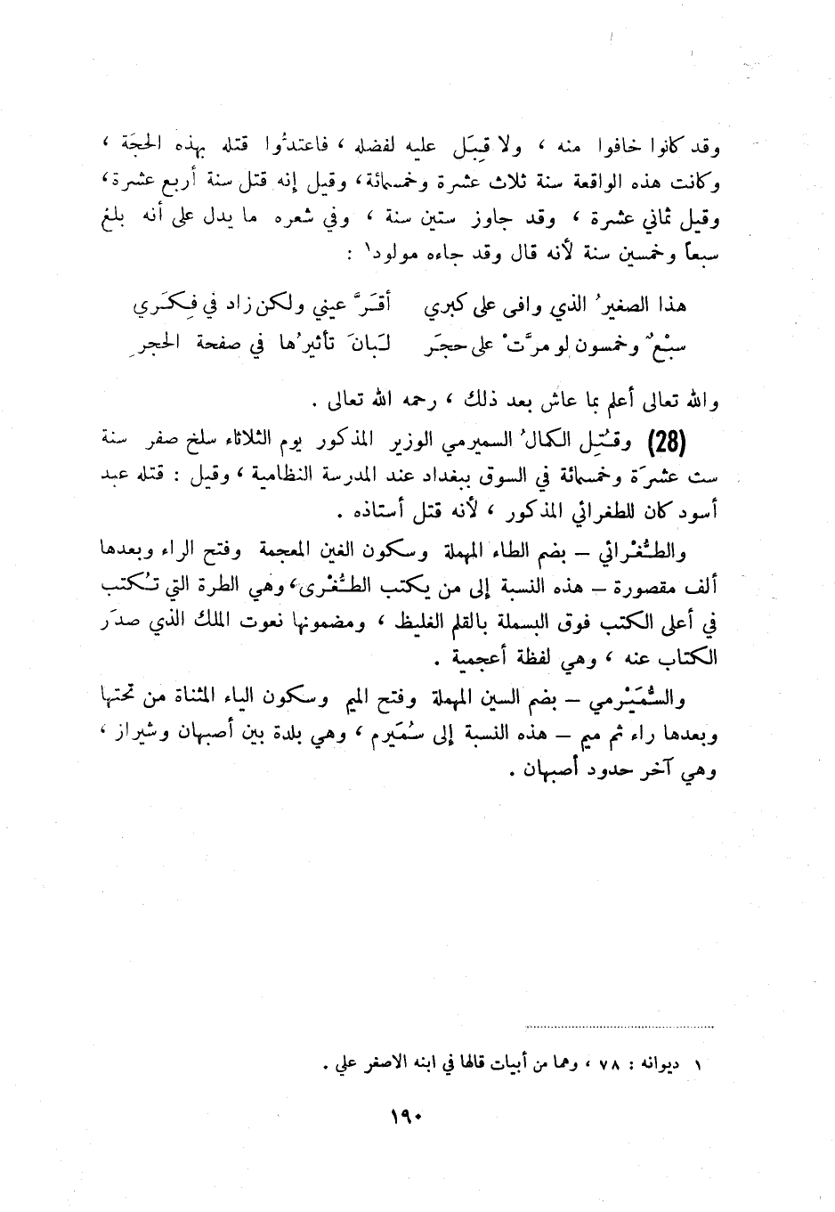 (28) وقتل الكمال السميرمي الوزير المذكور يوم الثلاثاء سلخ صفر سنة ست عشرة وخمسمائة في السوق ببغداد عند المدرسة النظامية، وقيل: قتله عبد أسود كان للطغرائي المذكور، لأنه قتل أستاذه.