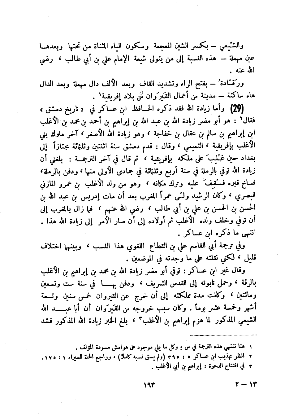 (29) وأما زيادة الله فقد ذكره الحافظ ابن عساكر في " تاريخ دمشق " فقال (2) : هو أبو مضر زيادة الله بن عبد الله بن إبراهيم بن أحمد بن محمد بن الأغلب ابن إبراهيم بن سالم بن عقال بن خفاجة، وهو زيادة الله الأصغر، آخر ملوك بني الأغلب بإفريقية، التميمي، وقال: قدم دمشق سنة اثنتين وثلثمائة مجتازاً إلى بغداد حين غلب على ملكه بإفريقية، ثم قال في آخر الترجمة: بلغني أن زيادة الله توفي بالرملة في سنة أربع وثلثمائة في جمادى الأولى منها، ودفن بالرملة، فساخ قبره فسقف عليه وترك مكانه، وهو من ولد الأغلب بن عمرو المازني البصري، وكان الرشيد ولى عمراً المغرب بعد أن مات إدريس بن عبد الله بن الحسن بن الحسن بن علي بن أبي طالب، رضي الله عنهم، فما زال بالمغرب إلى أن توفي وخلف ولده الأغلب ثم أولاده إلى أن صار الأمر إلى زيادة الله هذا. انتهى ما ذكره ابن عساكر.