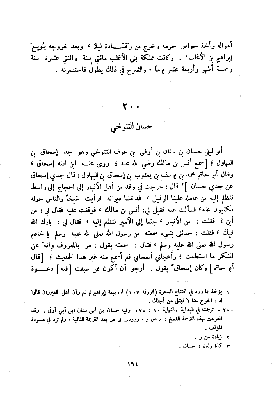 أبو ليلى حسان بن سنان بن أوفى بن عوف التنوخي وهو جد إسحاق بن البهلول؛ [سمع أنس بن مالك رضي الله عنه؛ روى عنه ابن ابنه إسحاق، وقال أبو حاتم محمد بن يوسف بن يعقوب بن إسحاق بن البهلول: قال جدي إسحاق عن جدي حسان] (3) قال: خرجت في وفد من أهل الأنبار إلى الحجاج إلى واسط نتظلم إليه من عامله علينا الرقيل، فدخلنا ديوانه فرأيت شيخاً والناس حوله يكتبون عنه، فسألت عنه فقيل لي: أنس بن مالك، فوقفت عليه فقال لي: من أين فقلت: من الأنبار، جئنا إلى الأمير نتظلم إليه، فقال لي: بارك الله فيك، فقلت: حدثني بشيء سمعته من رسول الله صلى الله عليه وسلم يا خادم رسول الله صلى الله عليه وسلم، فقال: سمعته يقول: مر بالمعروف وأنه عن المنكر ما استطعت؛ وأعجلني أصحابي فلم أسمع منه غير هذا الحديث؛ [قال أبو حاتم] وكان إسحاق (4) يقول: أرجو أن أكون ممن سبقت [فيه] دعوة