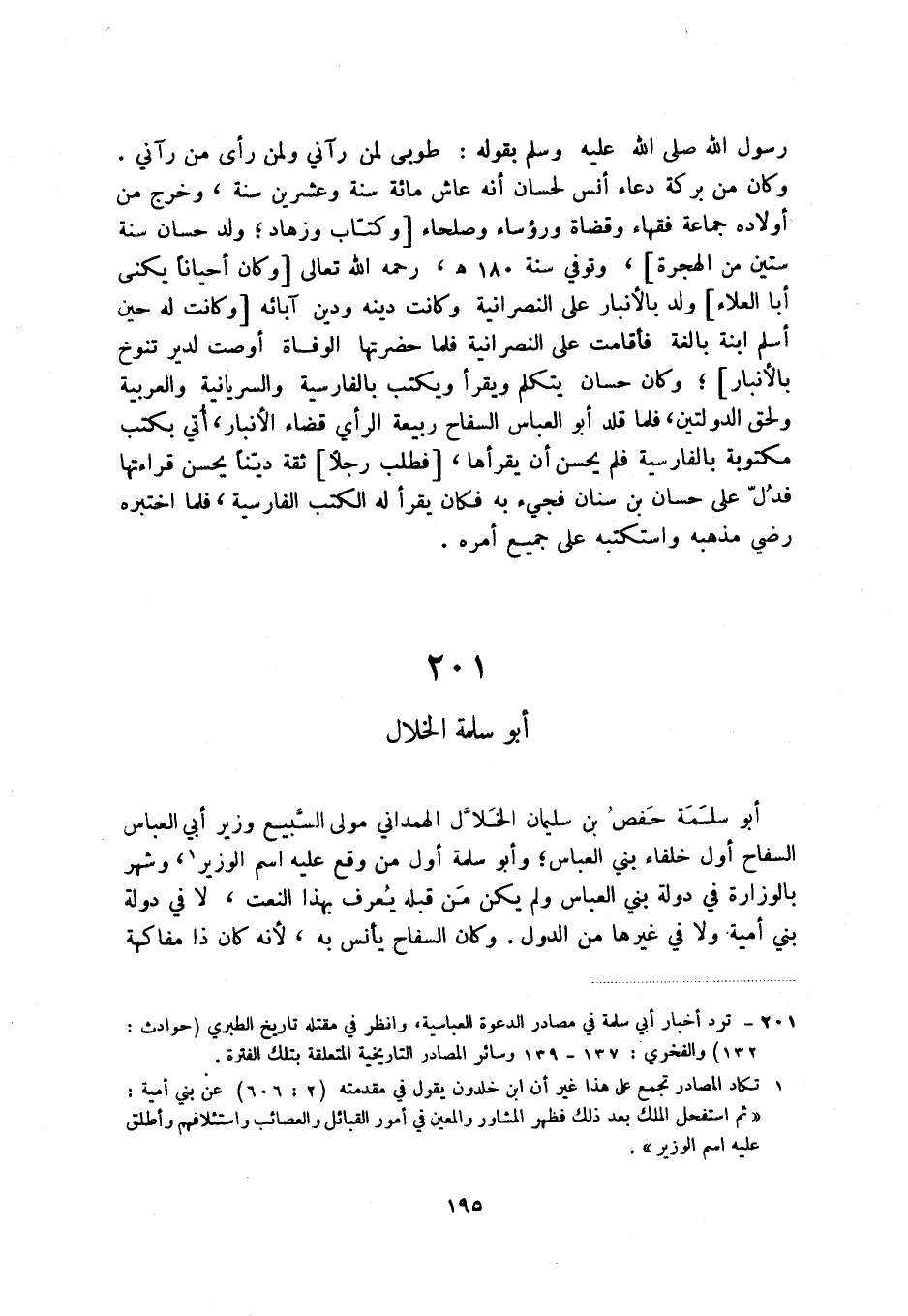 رسول الله صلى الله عليه وسلم بقوله: طوبى لمن رآني ولمن رأى من رآني. وكان من بركة دعاء أنس لحسان أنه عاش مائة سنة وعشرين سنة، وخرج من أولاده جماعة فقهاء وقضاة ورؤساء وصلحاء [وكتاب وزهاد؛ ولذ حسان سنة ستين من الهجرة] ، وتوفي سنة 180 رحمه الله تعالى [وكان أحياناً يكنى أبا العلاء] ولد بالأنبار على النصرانية وكانت دينه ودين آبائه [وكانت له حين أسلم ابنه بالغة فأقامت على النصرانية فلما حضرتها الوفاة أوصت لدير تنوخ بالأنبار] ؛ وكان حسان يتكلم ويقرأ ويكتب بالفارسية والسريانية والعربية ولحق الدولتين، فلما قلد أبو العباس السفاح ربيعة الرأي قضاء الأنبار، أتي بكتب مكتوبة بالفارسية فلم يحسن أن يقرأها، [فطلب رجلاً] ثقة ديناً يحسن قراءتها فدل على حسان بن سنان فجيء به فكان يقرأ له الكتب الفارسية، فلما اختبره رضي مذهبه واستكتبه على جميع أمره.