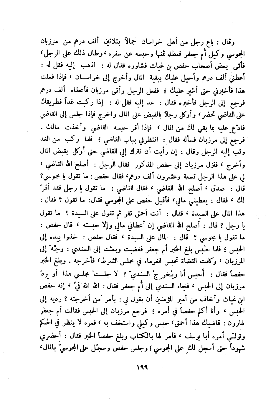 وقال: باع رجل من أهل خراسان جمالاً بثلاثين ألف درهم من مرزبان المجوسي وكيل أم جعفر فمطله ثمنها وحبسه عن سفره، وطال ذلك على الرجل، فأتى بعض أصحاب حفص بن غياث فشاوره فقال له: اذهب إليه فقل له: أعطني ألف درهم وأحيل عليك ببقية المال وأخرج إلى خراسان، فإذا فعلت هذا فأخبرني حتى أشير عليك؛ ففعل الرجل وأتى مرزبان فأعطاه ألف درهم فرجع إلى الرجل فأخبره فقال: عد إليه فقل له: إذا ركبت غداً فطريقك على القاضي تحضر، وأوكل رجلاً بالقبض على المال واخرج فإذا جلس إلى القاضي فادع عليه بما بقي لك من المال، فإذا أقر حبسه القاضي وأخذت مالك. فرجع إلى مرزبان فسأله فقال: انتظرني بباب القاضي؛ فلما ركب من الغد وثب إليه الرجل وقال: إن رأيت أن تترك إلي القاضي حتى أوكل بقبض المال وأخرج، فنزل مرزبان إلى حفص المذكور فقال الرجل: أصلح الله القاضي، لي على هذا الرجل تسعة وعشرون ألف درهم، فقال حفص: ما تقول يا مجوسي قال: صدق، أصلح الله القاضي، فقال القاضي: ما تقول يا رجل فقد أقر لك، فقال: يعطيني مالي، فأقبل حفص على المجوسي فقال: ما تقول فقال: هذا المال على السيدة، فقال: أنت أحمق تقر ثم تقول على السيدة ما تقول يا رجل قال: أصلح الله القاضي إن أعطاني مالي وإلا حبسته، قال حفص: ما تقول يا مجوسي قال: المال على السيدة، فقال حفص: خذوا بيده إلى الحبس؛ فلما حبس بلغ الخبر أم جعفر فغضبت وبعثت إلى السندي: وجه إلى المرزبان، وكانت القضاة تحبس الغرماء في مجلس الشرط، فأخرجه. وبلغ الخبر حفصاً فقال: أحبس أنا ويخرج السندي لا جلست مجلسي هذا أو يرد مرزبان إلى الحبس، فجاء السندي إلى أم جعفر فقال: الله الله في، إنه حفص ابن غياث وأخاف من أمير المؤمنين أ، يقول لي: بأمر من أخرجته رديه إلى الحبس، وأنا أكلم حفصاً في أمره؛ فرجع مرزبان إلى الحبس فقالت أم جعفر لهارون: قاضيك هذا أحمق، حبس وكيلي واستخف به، فمره لا ينظر في الحكم وتولي أمره أبا يوسف، فأمر لها بالكتاب وبلغ حفصاً الخبر فقال: أحضري شهوداً حتى أسجل لك على المجوسي؛ وجلس حفص وسجل على المجوسي بالمال