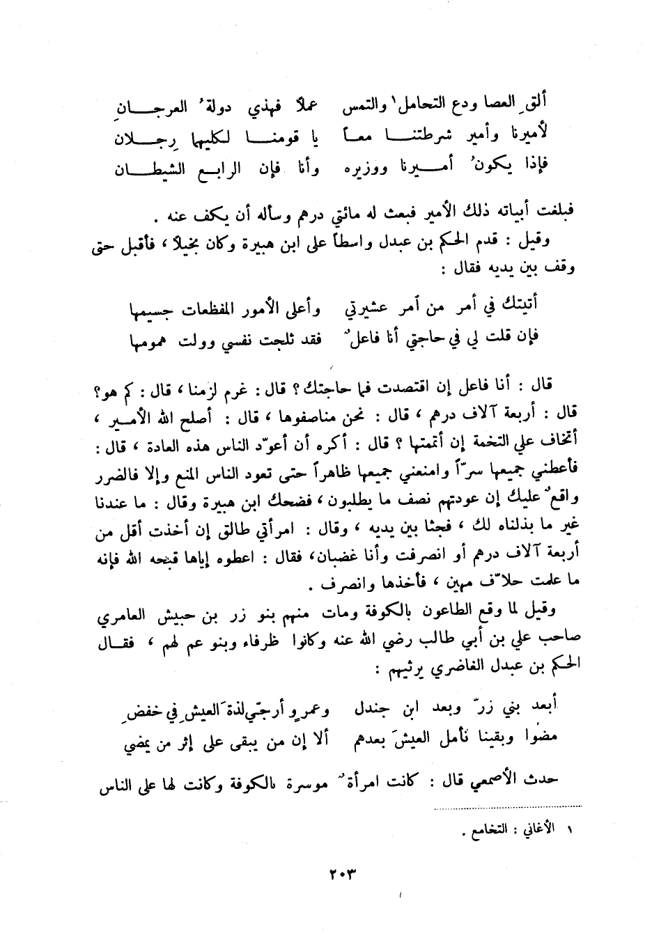 فإن قلت لي في حاجتي أنا فاعل ... فقد ثلجت نفسي وولت همومها قال: أنا فاعل إن اقتصدت فما حاجتك قال: غرم لزمنا، قال: كم هو قال: أربعة آلاف درهم، قال: نحن مناصفوها، قال: أصلح الله الأمير، أتخاف علي التخمة إن أممتها قال: أكره أن أعود الناس هذه العادة، قال: فأعطني جميعها سراً وامنعني جميعها ظاهراً حتى تعود الناس المنع وإلا فالضرر واقع عليك إن عودتهم نصف ما يطلبون، فضحك ابن هبيرة وقال: ما عندنا غير ما بذلناه لك، فجثا بين يديه، وقال: امرأتي طالق إن أخذت أقل من أربعة آلاف درهم أو انصرفت وأنا غضبان، فقال: اعطوه إياها قبحه الله فإنه ما علمت حلاف مهين، فأخذها وانصرف.