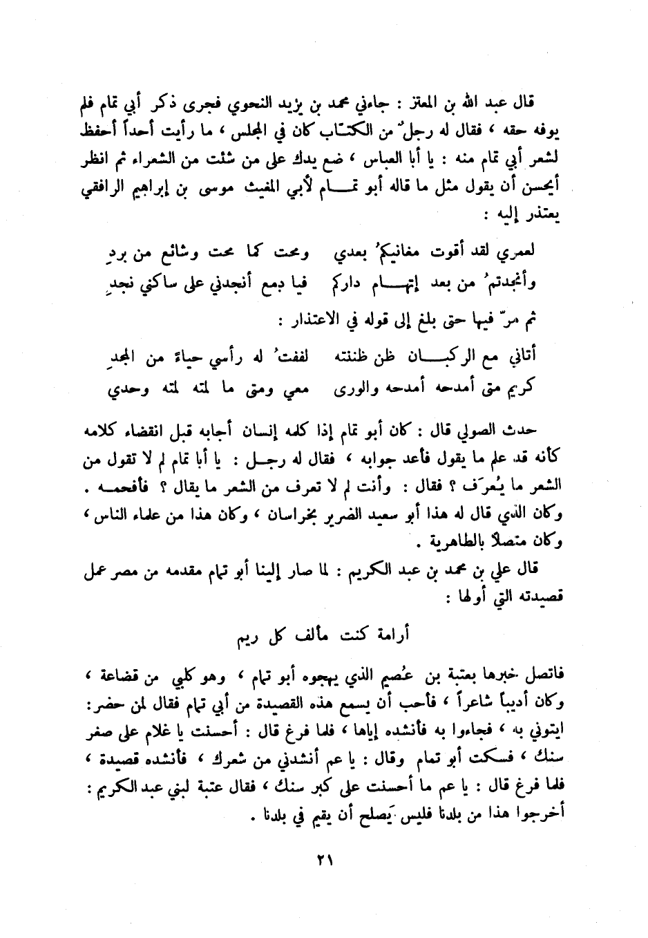 قال عبد الله بن المعتز: جاءني محمد بن يزيد النحوي فجرى ذكر أبي تمام فلم يوفه حقه، فقال له رجل من الكتاب كان في المجلس، ما رأيت أحداً أحفظ لشعر أبي تمام منه: يا أبا العباس، ضع يدك على من شئت من الشعراء ثم انظر أيحسن أن يقول مثل ما قاله أبو تمام لأبي المغيث موسى بن إبراهيم الرافقي يعتذر إليه: