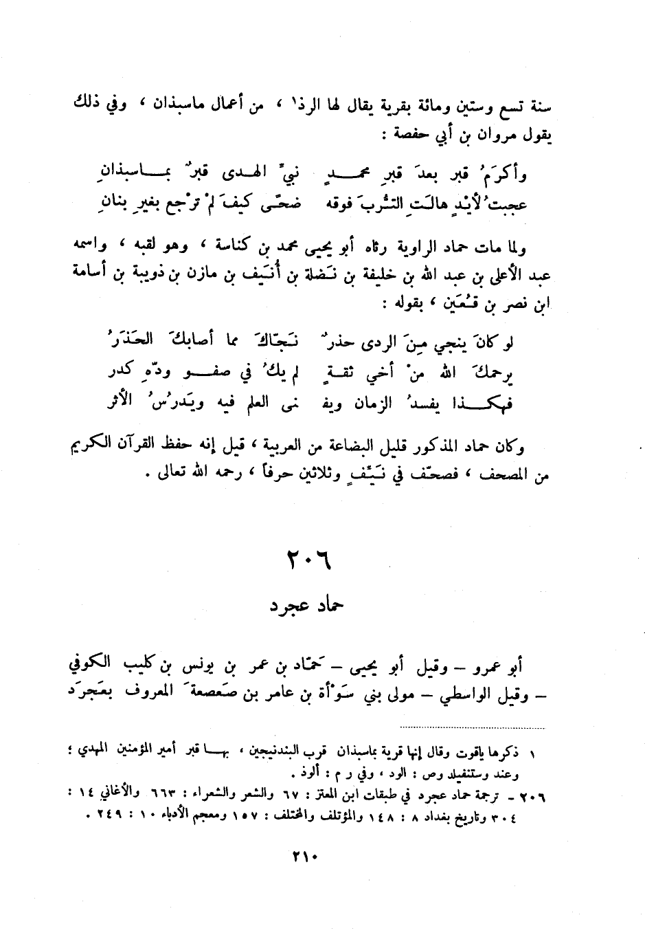 (2) ترجمة حماد عجرد في طبقات ابن المعتز: 67 والشعر والشعراء: 663 والأغاني 14: 304 وتاريخ بغداد 8: 148 والمؤتلف والمختلف: 157 ومعجم الأدباء 10: 249.