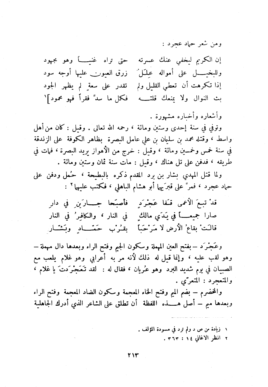 قالت بقاع الأرض لا مرحباً ... بقرب حماد وبشار وعجرد - بفتح العين المهملة وسكون الجيم وفتح الراء وبعدها دال مهملة - وهو لقب عليه، وإنما قيل له ذلك لأنه مر به أعرابي وهو غلام يلعب مع الصبيان في يوم شديد البرد وهو عريان، فقال له: لقد تعجردت يا غلام، والمتعجرد: المتعري.