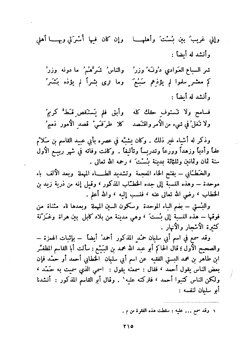 وقد سمع في اسم أبي سليمان حمد المذكور أحمد أيضاً - بإثبات الهمزة - والصحيح الأول؛ قال الحاكم أبو عبد الله محمد بن البيع: سألت أبا القاسم المظفر ابن طاهر بن محمد البستي الفقيه عن اسم أبي سليمان الخطابي أحمد أو حمد فإن بعض الناس يقول أحمد، فقال: سمعته يقول: اسمي الذي سميت به حمد، ولكن الناس كتبوا أحمد، فتركته عليه (1) . وقال أبو القاسم المذكور: أنشدنا أبو سليمان لنفسه: