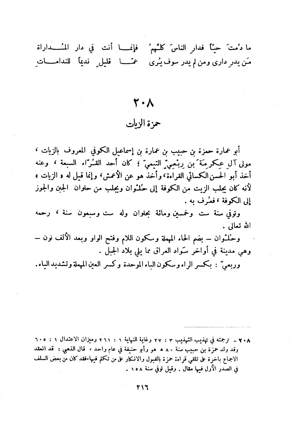(1) ترجمته في تهذيب التهذيب 3: 27 وغاية النهاية 1: 261 وميزان الاعتدال 1: 605 وقد ولد حمزة بن حبيب سنة 80 هـ هو وأبو حنيفة في عام واحد، قال الذهبي: قد انعقد الاجماع باخرة على تلقي قراءة حمزة بالقبول والإنكار على من تكلم فيها، فقد كان من بعض السلف في الصدر الأول فيها مقال، وقيل توفي سنة 158.