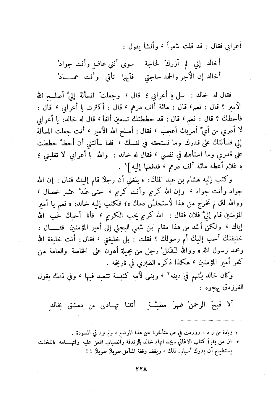 أخالد إن الأجر والحمد حاجتي ... فأيهما تأتي وأنت عماد فقال له خالد: سل يا أعرابي؛ قال، وجعلت المسألة إلي أصلح الله الأمير قال: نعم، قال: مائة ألف درهم، قال: أكثرت يا أعرابي، قال: فأحطك قال: نعم، قال: قد حططتك تسعين ألفاً، قال له خالد: يا أعرابي لا أدري من أي أمريك أعجب، فقال: أصلح الله الأمير، أنت جعلت المسألة إلي فسألتك على قدرك وما تستحقه في نفسك، فلما سألتني أن أحط حططت على قدري وما استأهله في نفسي، فقال له خالد: والله يا أعرابي لا تغلبني؛ يا غلام أعطه مائة ألف درهم، فدفعها إليه] (1) .