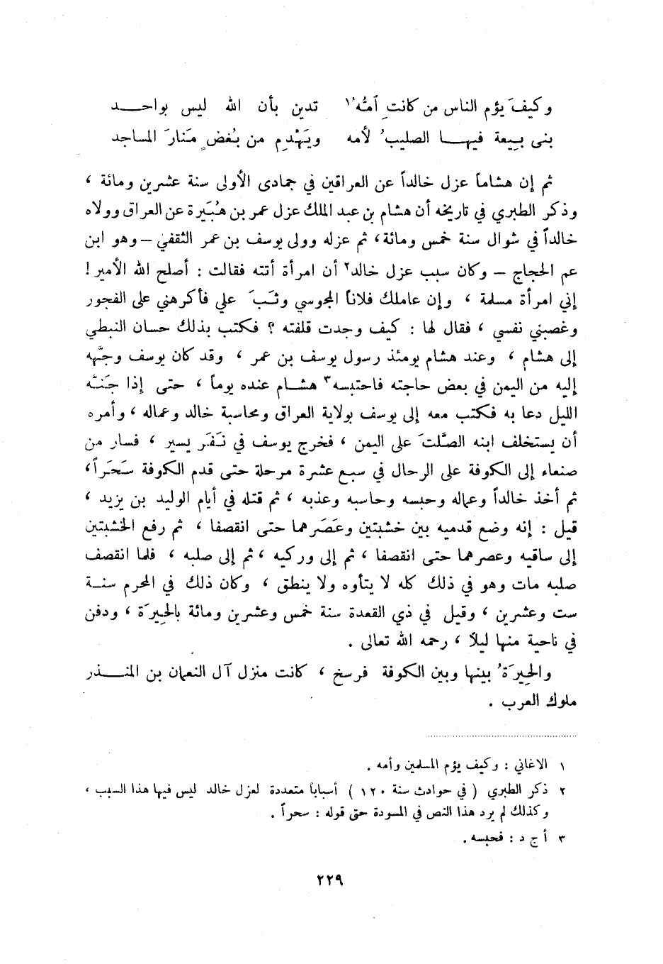 (2) ذكر الطبري (في حوادث سنة 120) أسباباً متعددة لعزل خالد ليس فيها هذا السبب، وكذلك لم يرد هذا النص في المسودة حتى قوله: سحراً.