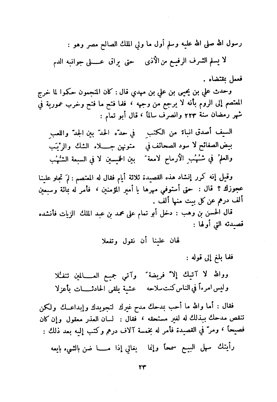 وحدث علي بن يحيى بن علي بن مهدي قال: كان المنجمون حكموا لما خرج المعتصم إلى الروم بأنه لا يرجع من وجهه، فلما فتح ما فتح وخرب عمورية في شهر رمضان سنة 223 وانصرف سالماً، قال أبو تمام: