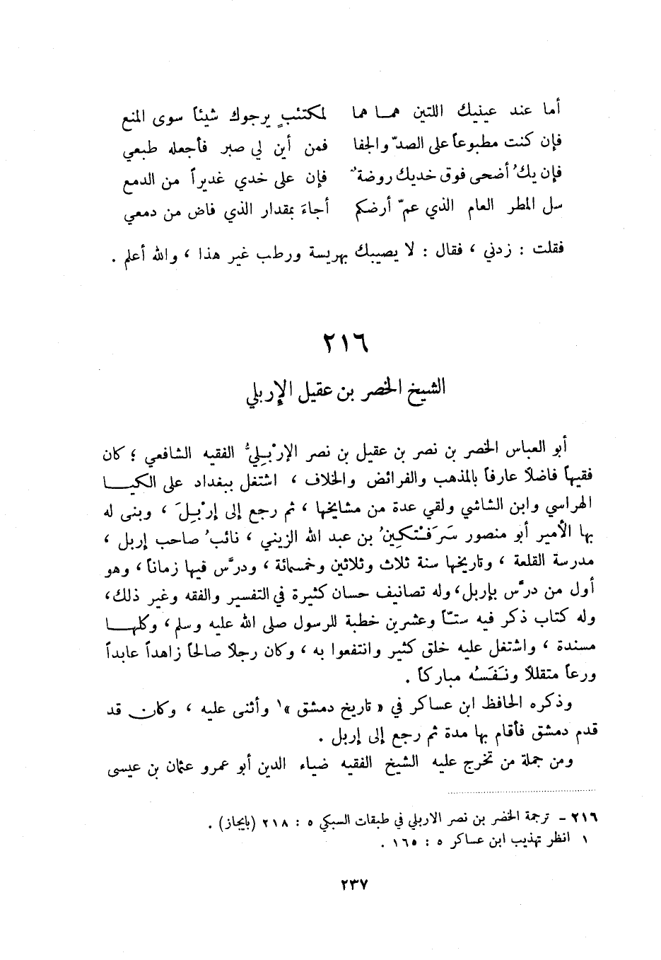 (1) ترجمة الخضر بن نصر الاربلي في طبقات السبكي 5: 218 (بإيجاز) .