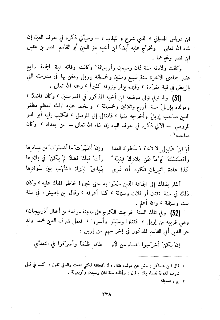 (31) ولما توفي تولى موضعه ابن أخيه المذكور في المدرستين، وكان فاضلاً، ومولده بإربل سنة أربع وثلاثين وخمسمائة، وسخط عليه الملك المعظم مظفر الدين صاحب إربل وأخرجه منها، فانتقل إلى الموصل، فكتب إليه أبو الدر الرومي - الآتي ذكره في حرف الياء إن شاء الله تعالى - من بغداد، وكان صاحبه (2) :
