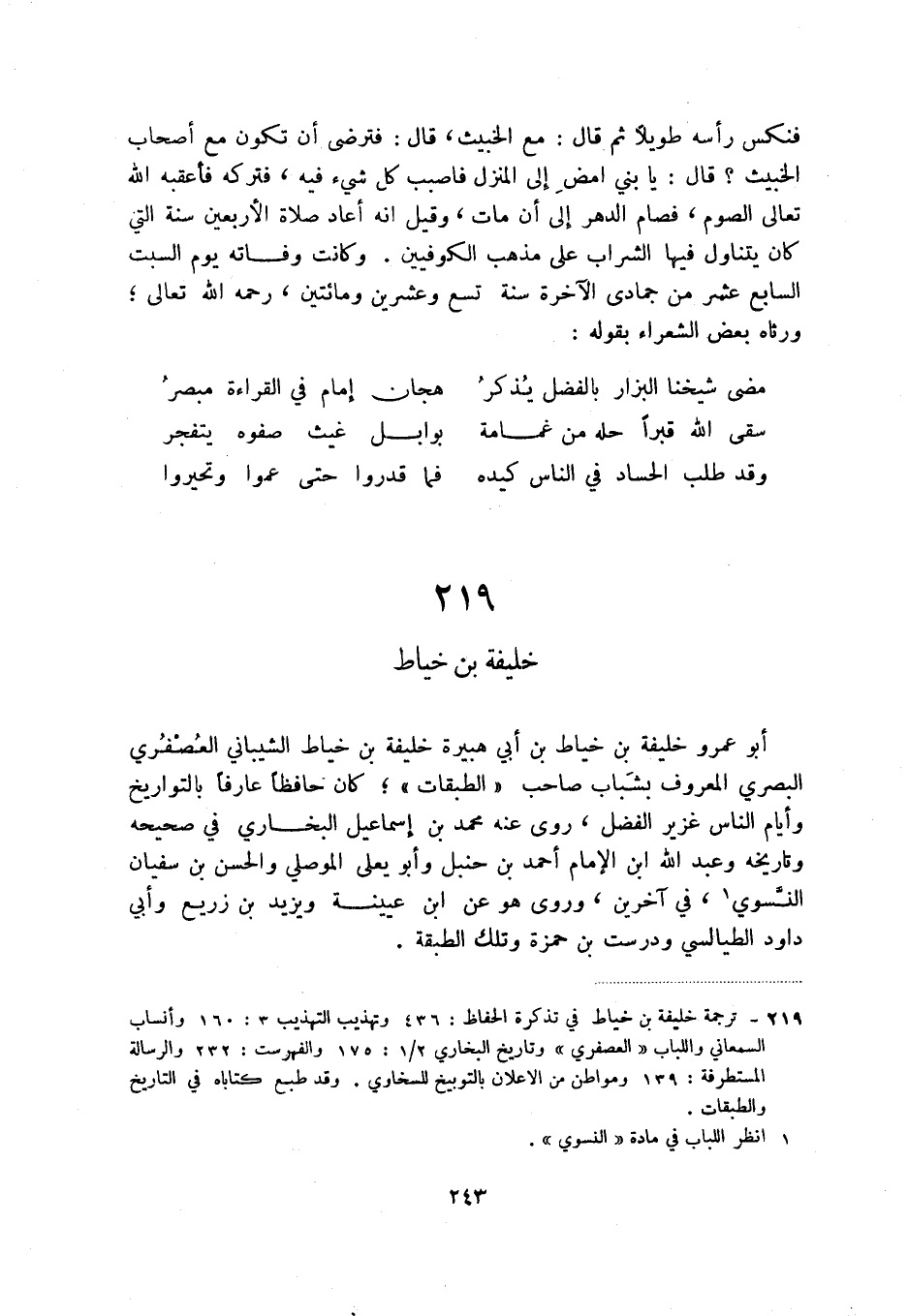 أبو عمرو خليفة بن خياط بن أبي هبيرة خليفة بن خياط الشيباني العصفري البصري المعروف بشباب صاحب " الطبقات "؛ كان حافظاً عارفاً بالتواريخ وأيام الناس غزير الفضل، روى عنه محمد بن إسماعيل البخاري في صحيحه وتاريخه وعبد الله ابن الإمام أحمد بن حنبل وأبو يعلى الموصلي والحسن بن سفيان النسوي (2) ، في آخرين، وروى هو عن ابن عيينة ويزيد بن زريع وأبي داود الطيالسي ودرست بن حمزة وتلك الطبقة.