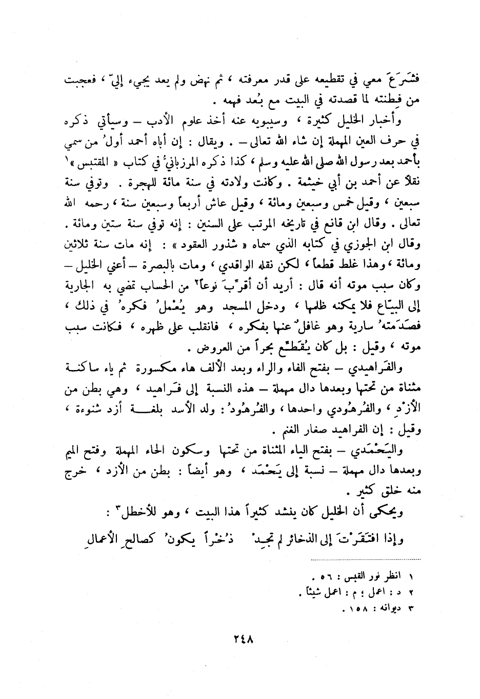 وأخبار الخليل كثيرة، وسيبويه عنه أخذ علوم الأدب - وسيأتي ذكره في حرف العين المهملة إن شاء الله تعالى -. ويقال: إن أباه أحمد أول من سمي بأحمد بعد رسول الله صلى الله عليه وسلم، كذا ذكره المرزباني في كتاب " المقتبس " (1) نقلاً عن أحمد بن أبي خيثمة. وكانت ولادته في سنة مائة للهجرة. وتوفي سنة سبعين، وقيل خمس وسبعين ومائة، وقيل عاش أربعاً وسبعين سنة، رحمه الله تعالى. وقال ابن قانع في تاريخه المرتب على السنين: إنه توفي سنة ستين ومائة. وقال ابن الجوزي في كتابه الذي سماه " شذور العقود ": إنه مات سنة ثلاثين ومائة، وهذا غلط قطعاً، لكن نقله الواقدي، ومات بالبصرة - أعني الخليل - وكان سبب موته أنه قال: أريد أن أقرب نوعاً (2) من الحساب تمضي به الجارية إلى البياع فلا يمكنه ظلمها، ودخل المسجد وهو يعمل فكره في ذلك، فصدمته سارية وهو غافل عنها بفكره، فانقلب على ظهره، فكانت سبب موته، وقيل: بل كان يقطع بحراً من العروض.