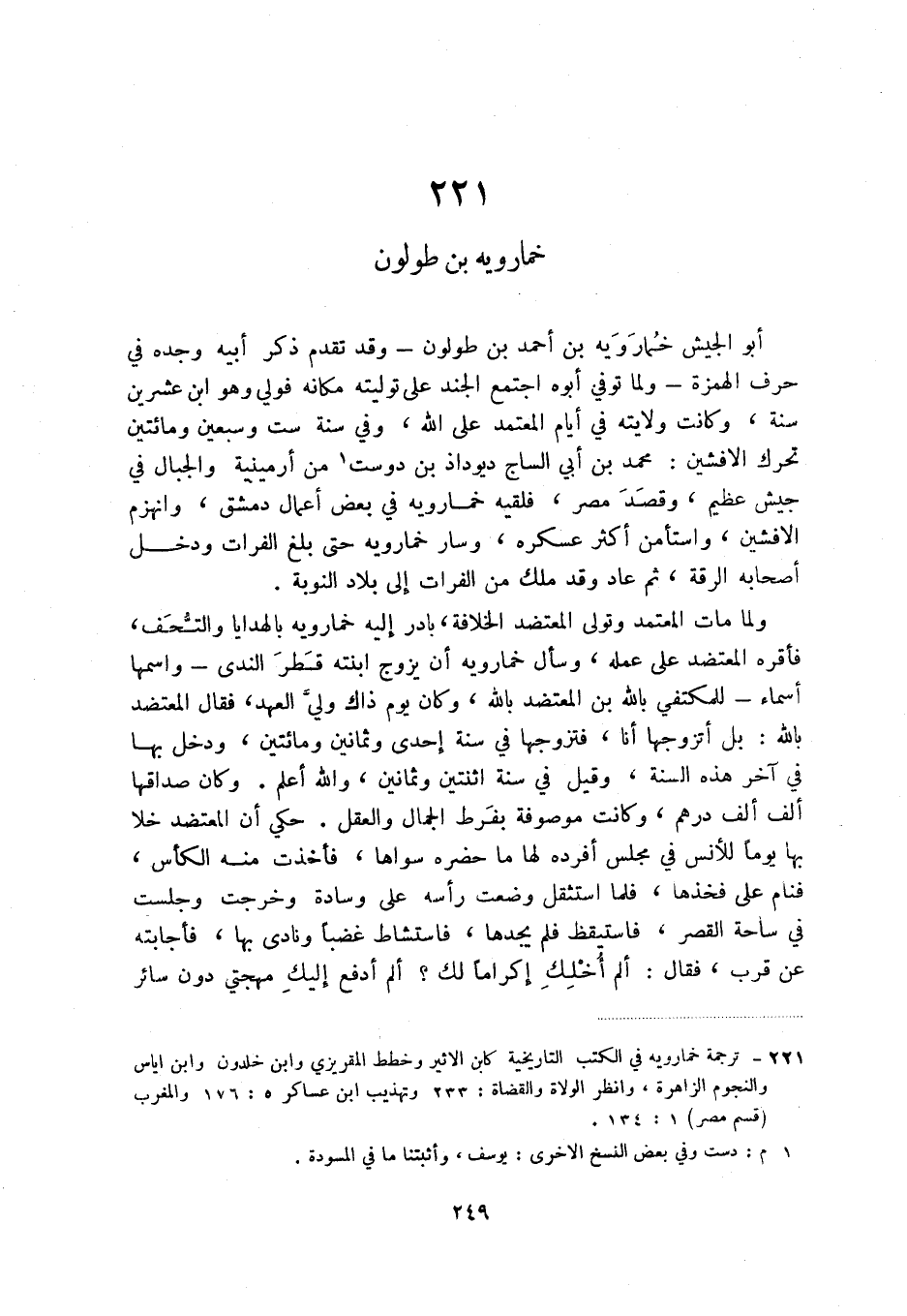 (1) ترجمة خمارويه في الكتب التاريخية كابن الأثير وخطط المقريزي وابن خلدون وابن إياس والنجوم الزاهرة، وانظر الولاة والقضاة: 233 وتهذيب ابن عساكر 5: 176 والمغرب (قسم مصر) 1: 134.