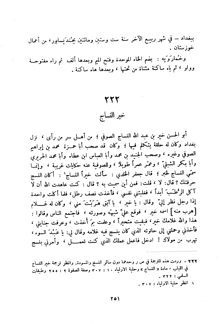 (1) وردت هذه الترجمة في ص ر وحدهما دون سائر النسخ والمسودة. وانظر ترجمة خير النساج في اللباب، مادة " النساج " وحلية الأولياء 10: 307 وصفة الصفوة 2: 255 وطبقات السلمي: 322.