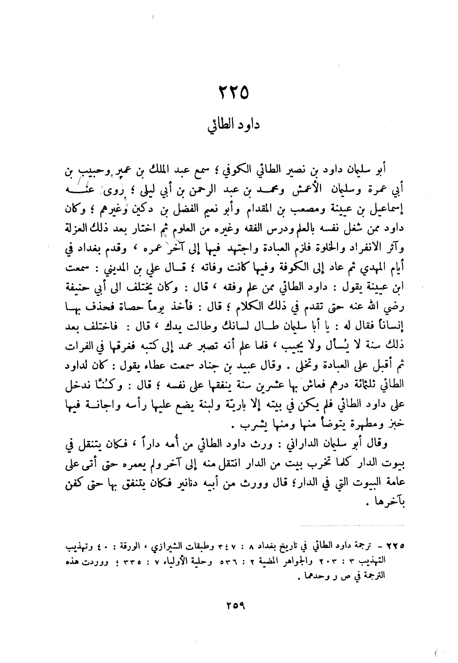(1) ترجمة داود الطائي في تاريخ بغداد 8: 347 وطبقات الشيرازي، الورقة: 40 وتهذيب التهذيب 3: 203 والجواهر المضية 2: 536 وحلية الأولياء 7: 335؛ ووردت هذه الترجمة في ص ر وحدهما.
