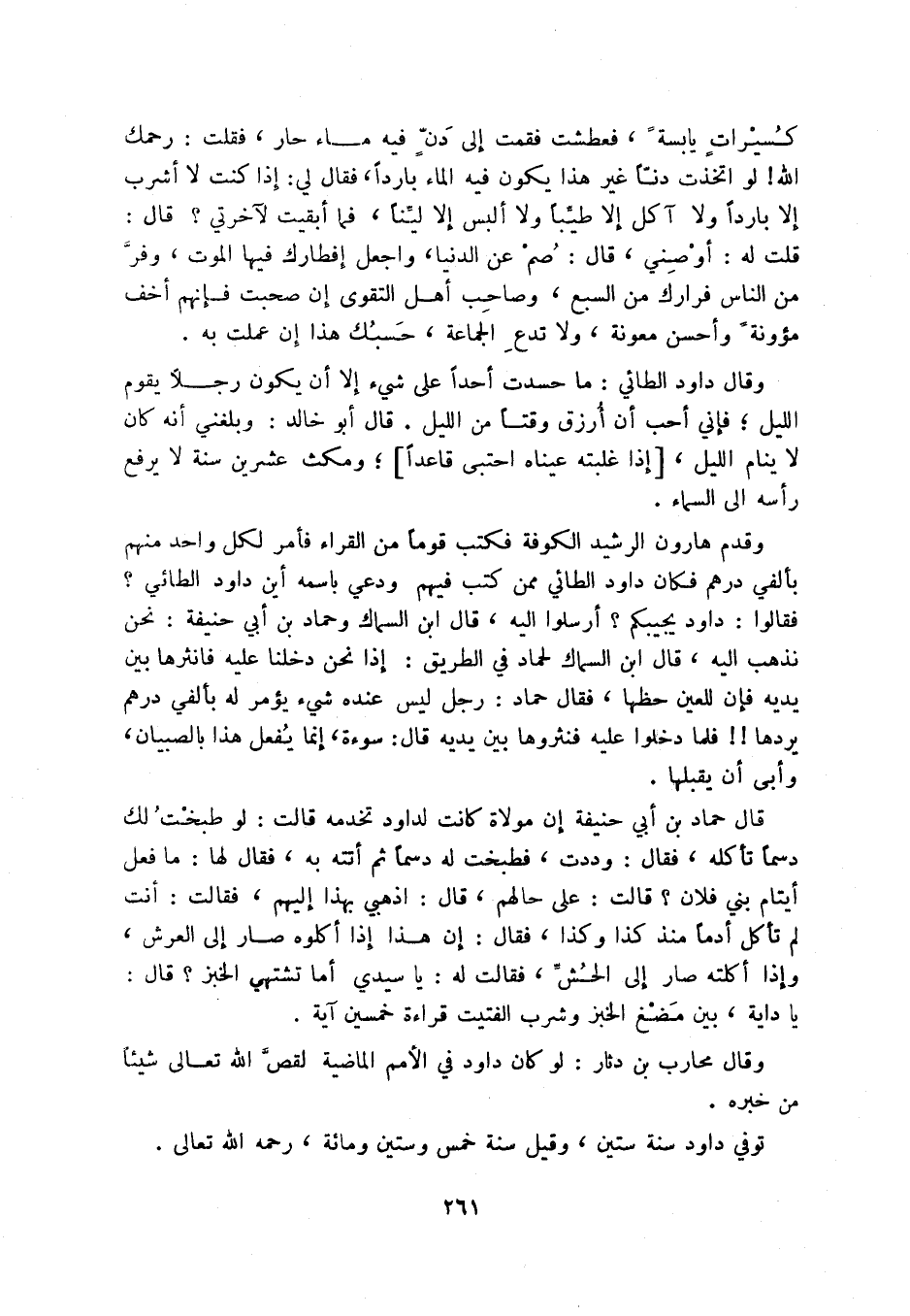 وقال داود الطائي: ما حسدت أحداً على شيء إلا أن يكون رجلاً يقوم الليل؛ فإني أحب أن أرزق وقتاً من الليل. قال أبو خالد: وبلغني أنه كان لا ينام الليل، [إذا غلبته عيناه احتبى قاعداً] ؛ ومكث عشرين سنة لا يرفع رأسه إلى السماء.