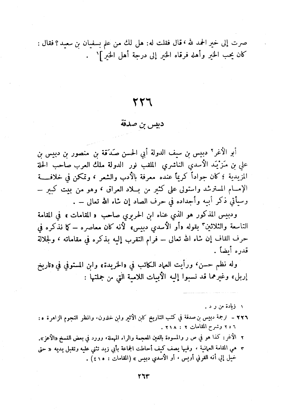 (2) ترجمة دبيس بن صدفة في كتب التاريخ كان الأثير وابن خلدون. وانظر النجوم الزاهرة 5: 256 وشرح المقامات 2: 218.