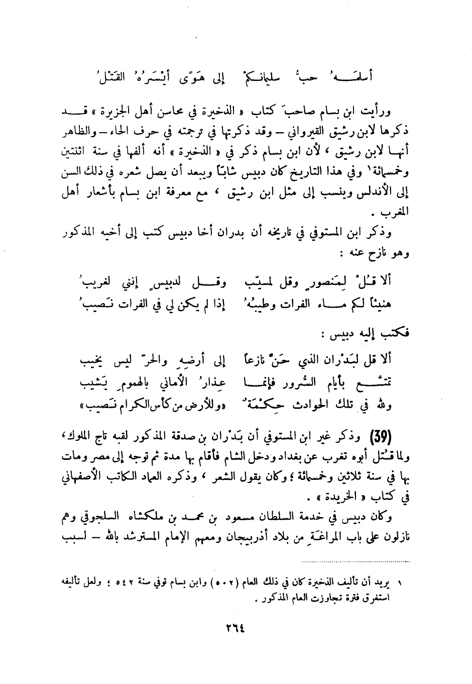 أسلمه حب سليمانكم ... إلى هوى أيسره القتل ورأيت ابن بسام صاحب كتاب " الذخيرة في محاسن أهل الجزيرة " قد ذكرها لابن رشيق القيروان - وقد ذكرتها في ترجمته في حرف الحاء - والظاهر أنها لابن رشيق، لأن ابن بسام ذكر في " الذخيرة " أنه ألفها في سنة اثنتين وخمسمائة (1) وفي هذا التاريخ كان دبيس شاباً ويبعد أن يصل شعره في ذلك السن إلى الأندلس وينسب إلى مثل ابن رشيق، مع معرفة ابن بسام بأشعار أهل المغرب.