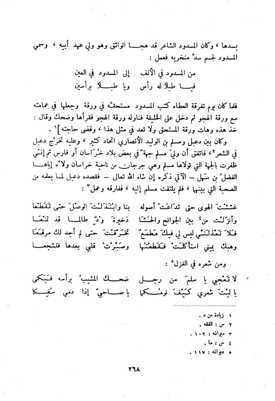 فيا طبلاً له رأس ... ويا طبلاً برأسين فلما كان يوم تفرقة العطاء كتب المسدود مستحقه في ورقة وجعلها في عمامته مع ورقة الهجو ثم دخل على الخليفة فناوله ورقة الهجو فقرأها وضحك وقال: خذ هذه وهات ورقة المستحق ولا تعد في مثل هذا، وقضى حاجته] (1) .