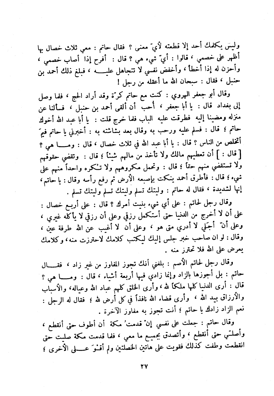 وقال أبو جعفر الهروي: كنت مع حاتم كرة وقد أراد الحج، فلما وصل إلى بغداد قال: يا أبا جعفر، أحب أن ألقى أحمد بن حنبل، فسألنا عن منزله ومضينا إليه فطرقت عليه الباب فلما خرج قلت: يا أبا عبد الله أخوك حاتم؛ قال: فسلم عليه ورحب به وقال بعد بشاشته به: أخبرني يا حاتم فيم أتخلص من الناس قال: يا أبا عبد الله في ثلاث خصال، قال: وما هي [قال:] أن تعطيهم مالك ولا تأخذ من مالهم شيئاً؛ قال: وتقضي حقوقهم ولا تستقضي منهم حقاً؛ قال: وتحمل مكروههم ولا تكره واحداً منهم على شيء؛ قال: فأطرق احمد ينكت بإصبعه الأرض ثم رفع رأسه وقال: يا حاتم، إنها لشديدة، فقال له حاتم: وليتك تسلم وليتك تسلم وليتك تسلم.