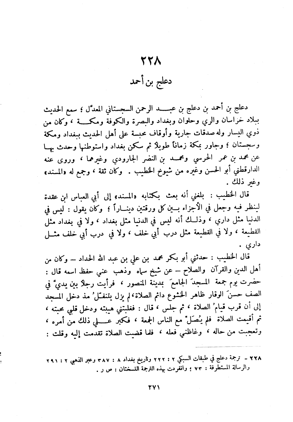 (1) ترجمة دعلج في طبقات السبكي 2: 222 وتاريخ بغداد 8: 387 وعبر الذهبي 2: 291 والرسالة المستطرفة: 73؛ وانفردت بهذه الترجمة النسختان: ص ر.