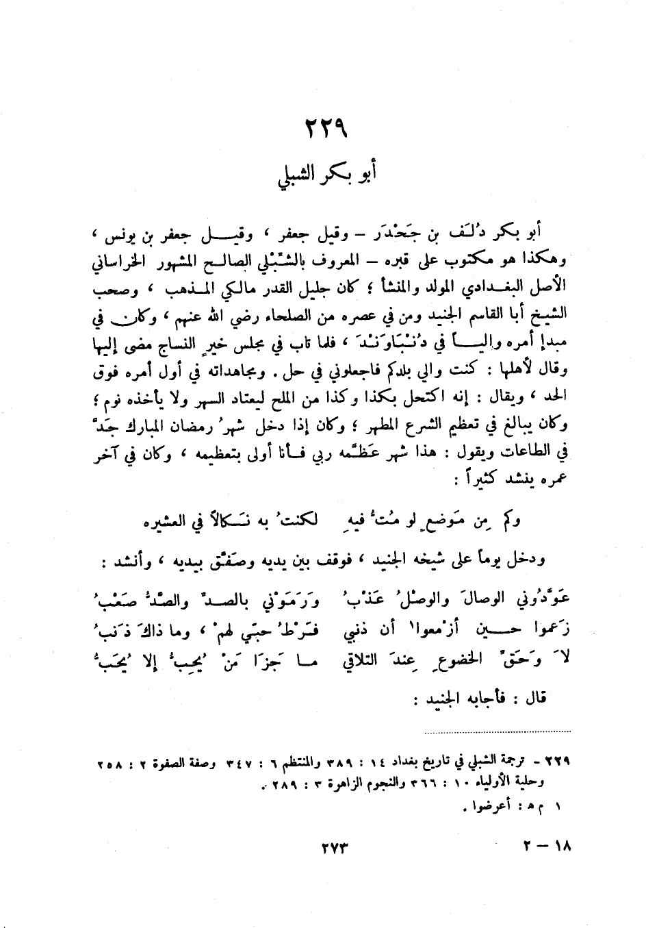 (1) ترجمة الشبلي في تاريخ بغداد 14: 389 والمنتظم 6: 347 وصفة الصفوة 2: 258 وحلية الأولياء 10: 366 والنجوم الزاهرة 3: 289.