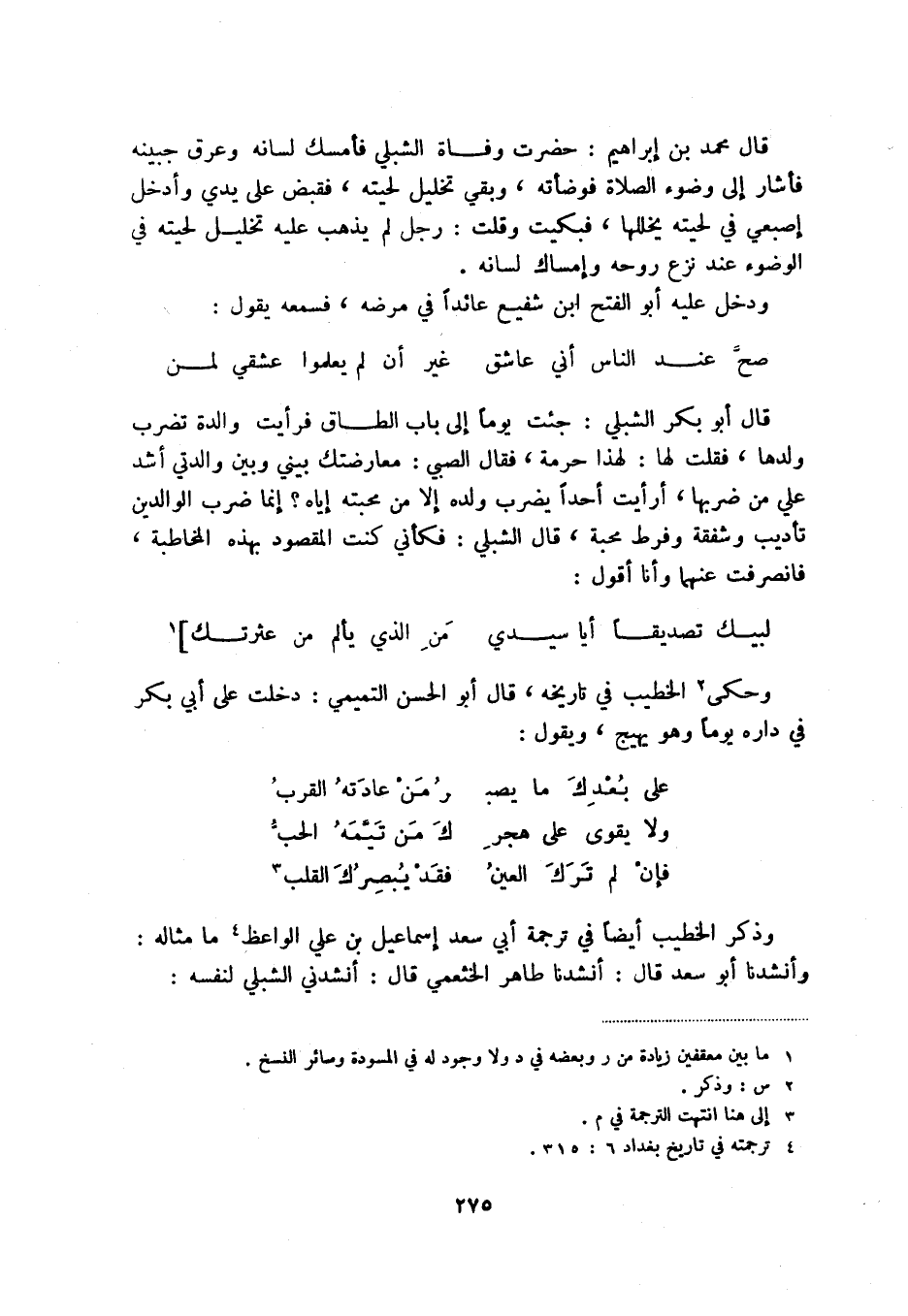 فإن لم ترك العين ... فقد يبصرك القلب (3) وذكر الخطيب أيضاً في ترجمة أبي سعد إسماعيل بن علي الواعظ (4) ما مثاله: وأنشدنا أبو سعد قال: أنشدنا طاهر الخثعمي قال: أنشدني الشبلي لنفسه: