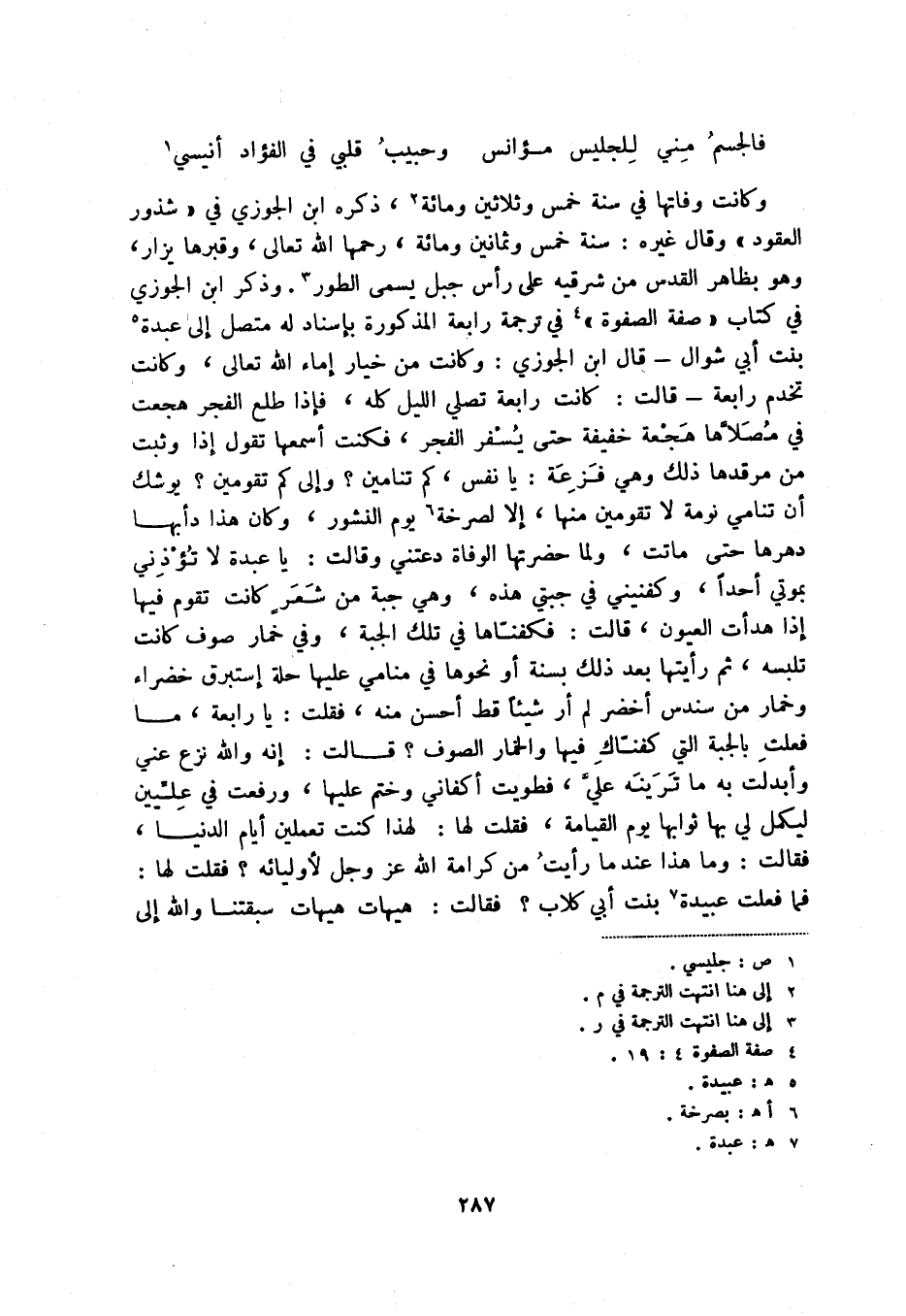 فالجسم مني للجليس مؤانس ... وحبيب قلبي في الفؤاد أنيسي (1) وكانت وفاتها في سنة خمس وثلاثين ومائة (2) ، ذكره ابن الجوزي في " شذور العقود " وقال غيره: سنة خمس وثمانين ومائة، رحمهما الله تعالى، وقبرها يزار، وهو بظاهر القدس من شرقيه على رأس جبل يسمى الطور (3) . وذكر ابن الجوزي في كتاب " صفة الصفوة " (4) في ترجمة رابعة المذكورة بإسناد له متصل إلى عبدة (5) بنت أبي شوال - قال ابن الجوزي: وكانت من خيار إماء الله تعالى، وكانت تخدم رابعة - قالت: كانت رابعة تصلي اليل كله، فإذا طلع الفجر هجعت في مصلاها هجعة خفيفة حتى يسفر الفجر، فكنت أسمعها تقول إذا وثبت من مرقدها ذلك وهي فزعة: يا نفس، كم تنامين وإلى كم تقومين يوشك أن تنامي نومة لا تقومين منها، إلا لصرخة (6) يوم النشور، وكان هذا دأبها دهرها حتى ماتت، ولما حضرتها الوفاة دعتني وقالت: يا عبدة لا تؤذني بموتي أحداً، وكفنيني في جبتي هذه، وهي جبة من شعر كانت تقوم فيها إذا هدأت العيون، قالت: فكفناها في تلك الجبة، وفي خمار صوف كانت تلبسه، ثم رأيتها بعد ذلك بسنة أو نحوها في منامي عليها حلة إستبرق خضراء وخمار من سندس أخضر لم ار شيئاً قط أحسن منه، فقلت: يا رابعة، ما فعلت بالجبة التي كفناك فيها والخمار الصوف قالت: إنه والله نزع عني وأبدلت به ما ترينه علي، فطويت أكفاني وختم عليها، ورفعت في عليين ليكمل لي بها ثوابها يوم القيامة، فقلت لها: لهذا كنت تعملين أيام الدنيا، فقالت: وما هذا عندما رأيت من كرامة الله عز وجل لأوليائه فقلت لها: فما فعلت عبيدة (7) بنت أبي كلاب فقالت: هيهات هيهات سبقتنا والله إلى