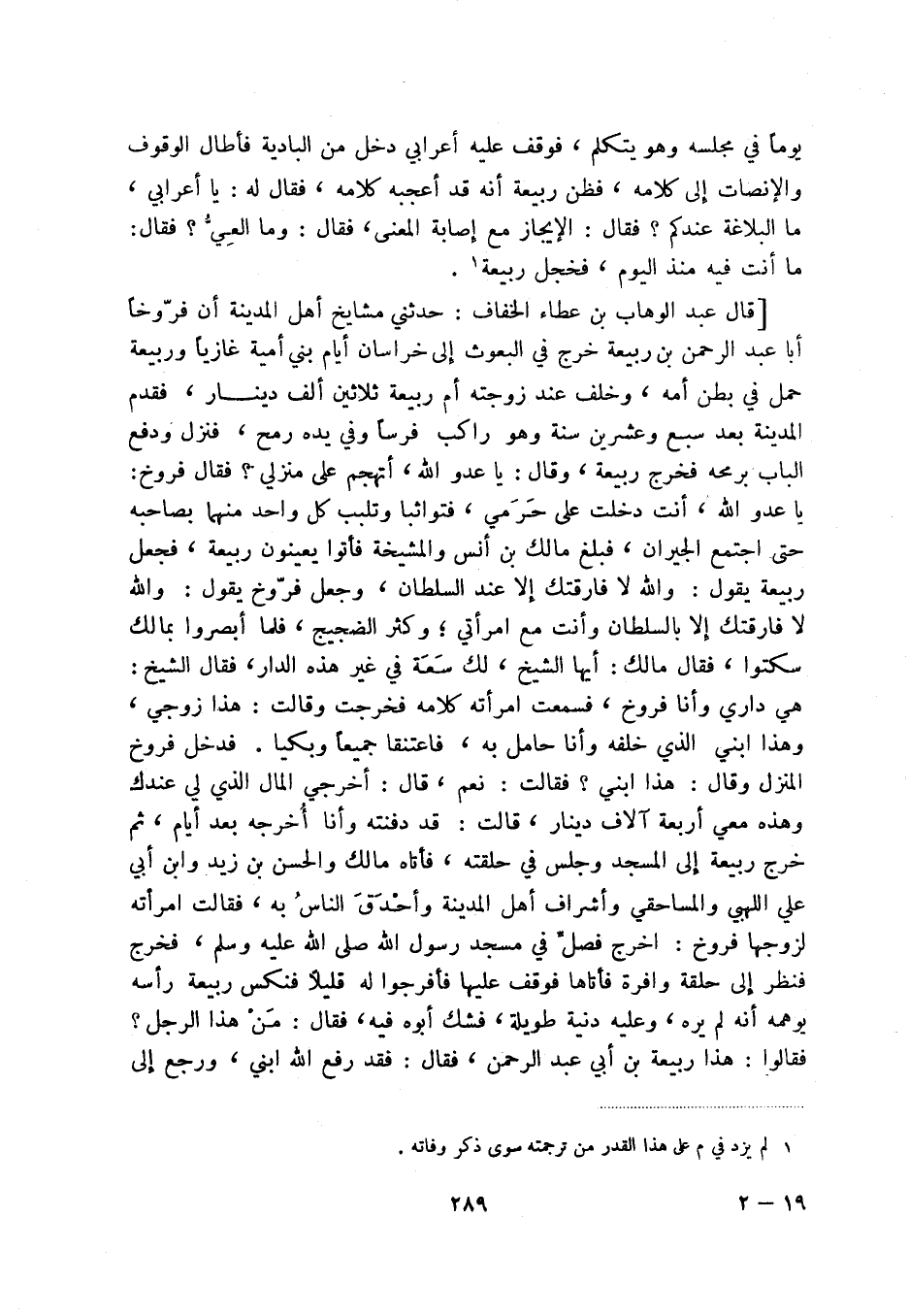 [قال عبد الوهاب بن عطاء الخفاف: حدثني مشايخ أهل المدينة أن فروخاً أبا عبد الرحمن بن ربيعة خرج في البعوث إلى خراسان أيام بني أمية غازياً وربيعة حمل في بطن أمه، وخلف عند زوجته أم ربيعة ثلاثين ألف دينار، فقدم المدينة بعد سبع وعشرين سنة وهو راكب فرساً وفي يده رمح، فنزل ودفع الباب برمحه فخرج ربيعة، وقال: يا عدو الله، أتهجم على منزلي فقال فروخ: يا عدو الله، أنت دخلت على حرمي، فتؤاثبا وتلبب كل واحد منهما بصاحبه حتى اجتمع الجيران، فبلغ مالك بن أنس والمشيخة فأتوا يعينون ربيعة، فجعل ربيعة يقول: والله لا فارقتك إلا عند السلطان، وعل فروخ يقول: والله لا فارقتك إلا بالسلطان وأنت مع امرأتي؛ وكثر الضجيج، فلما أبصروا بمالك سكتوا، فقال مالك: أيها الشيخ، لك سعة في غير هذه الدار، فقال الشيخ: هي داري وأنا فروخ، فسمعت امرأته كلامه فخرجت وقالت: هذا زوجي، وهذا ابني الذي خلفه وأنا حامل به، فاعتنقا جميعاً وبكيا. فدخل فروخ المنزل وقال: هذا ابني فقالت: نعم، قال: أخرجي المال الذي لي عندك وهذه معي أربعة آلاف دينار، قالت: قد دفنته وأنا أخرجه بعد أيام، ثم خرج ربيعةإلى المسجد وجلس في حلقته، فأتاه مالك والحسن بن زيد وابن أبي علي اللهبي والمساحقي وأشراف أهل المدينة وأحدق الناس به، فقالت امرأته لزوجها فروخ: اخرج فصل في مسجد رسول الله صلى الله عليه وسلمن فخرج فنظر إلى حلقة وافرة فأتاها فوقف عليها فأخرجوا له قليلاً فنكس ربيعة رأسه يوهمه أنه يره، وعليه دنية طويلة، فشك أبوه فيه، فقال: من هذا الرجل فقالوا: هذا ربيعة بن أبي عبد الرحمن، فقال: فقد رفع الله ابني، ورجع إلى