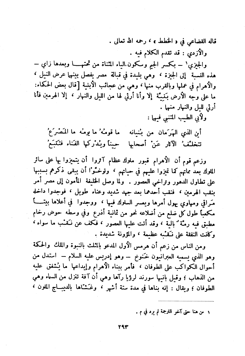 تتخلف الآثار عن أصحابها ... حيناً ويدركها الفناء فتتبع وزعم قوم أن الأهرام قبور ملوك عظام آثروا أن يتميزوا بها على سائر الملوك بعد مماتهم كما تميزوا عليهم في حياتهم، وتوخوا أن يبقى ذكرهم بسببها على تطاول الدهور وتراخي العصور. ولما وصل الخليفة المأمون إلى مصر أمر ينقب الهرمين، فنقب أحدهما بعد جهد شديد وعناء طويل، فوجدوا داخله مراقي ومهاوي يهول أمرها ويعسر السلوك فيها، ووجدوا في أعلاها بيتاَ مكعباً طول كل ضلع من أضلاعه نحو من ثمانية أذرع وفي وسطه حوض رخام مطبق فيه رمة بالية، وقد أتت عليها العصور، فكف عن نقب ما سواه، وكانت النفقة على نقبه عظيمة، والمؤونة شديدة.
