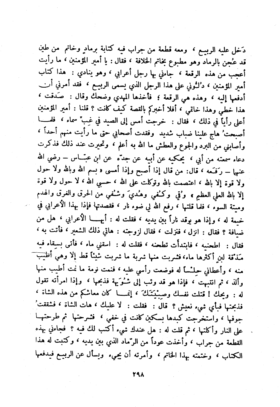 دخل عليه الربيع، ومعه قطعة من جراب فيه كتابة برماد وخاتم من طين قد عجن بالرماد وهو مطبوع بخاتم الخلافة، فقال: يا أمير المؤمنين، وما رأيت أعجب من هذه الرقعة، جاءني بها رجل أعرابي، وهو ينادي: هذا كتاب أمير المؤمنين، دلوني على هذا الرجل الذي يسمى الربيع، فقد أمرني أن أدفعها إليه، وهذه هي الرقعة؛ فأخذها المهدي وضحك وقال: صدقت، هذا خطي وهذا خاتمي، أفلا أخبركم بالقصة كيف كانت قلنا: أمير المؤمنين أعلى رأياً في ذلك، فقال: خرجت أمس إلى الصيد في غب سماء، فلما أصبحت هاج علينا ضباب شديد وفقدت أصحابي حتى ما رأيت منهم أحداً، وأصابني من البرد والجوع والعطش ما الله به أعلم، وتحيرت عند ذلك فذكرت دعاء سمعته من أبي، يحكيه عن أبيه عن جده عن ابن عباس - رضى الله عنهما - رفعه، قال: من قال إذا أصبح وإذا أمسى " بسم الله وبالله ولا حول ولا قوة إلا بالله، اعتصمت بالله وتوكلت على الله، حسبي الله، لا حول ولا قوة إلا بالله العلي العظيم " وقي وكفي وهدي وشفي من الحرق والغرق والهدم وميتة السوء، فلما قلتها، رفع الله لي ضوء نار، فقصدتها فإذا بهذا الأعرابي في خيمة له، وإذا هو يوقد ناراً بين يديه، فقلت له: أيها الأعرابي، هل من ضيافة فقال: انزل، فنزلت، فقال لزوجته: هاتي ذلك الشعير، فأتت به، فقال: اطحنيه، فابتدأت تطحنه، فقلت له: اسقني ماء، فأتى بسقاء فيه مذقة لبن أكثرها ماء، فشربت منها شربة ما شربت شيئاً قط إلا وهي أطيب منه، وأعطاني حلساً له فوضعت رأسي عليه، فنمت نومة ما نمت أطيب منها وألذ، ثم انتبهت، فإذا هو قد وثب إلى شويهة فذبحها، وإذا امرأته تقول له: ويحكّ قتلت نفسك وصبيتك، إنما كان معاشكم من هذه الشاة، فذبحتها فبأي شيء نعيش قال: فقلت: لا عليك، هات الشاة، فشققت جوفها، واستخرجت كبدها بسكين كانت في خفي، فشرحتها ثم طرحتها على النار وأكلتها، ثم قلت له: هل عندك شيء أكتب لك فيه فجاءني بهذه القطعة من جراب، وأخذت عوداً من الرماد الذي بين يديه، وكتبت له هذا الكتاب، وختمته بهذا الخاتم، وأمرته أن يجيء ويسأل عن الربيع فيدفعها