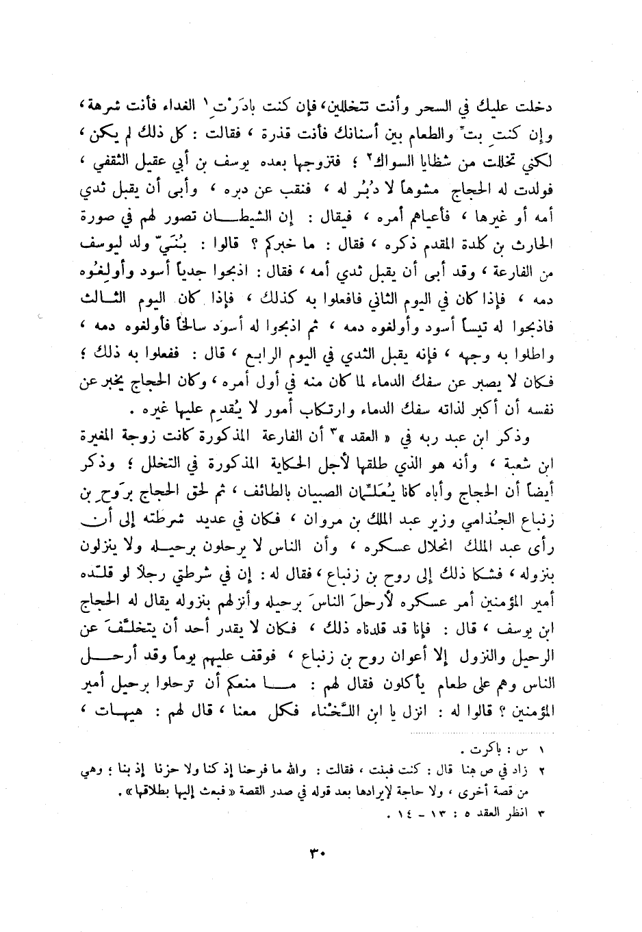 وذكر ابن عبد ربه في " العقد " (3) أن الفارعة المذكورة كانت زوجة المغيرة ابن شعبة، وانه هو الذي طلقها لأجل الحكاية المذكورة في التخلل؛ وذكر أيضاً أن الحجاج وأباه كان يعلمان الصبيان بالطائف، ثم لحق الحجاج بروح بن زنباع الجذامي وزير عبد الملك بن مروان، فكان في عديد شرطته إلى أن رآى عبد الملك انحلال عسكره وأن الناس لا يرحلون برحيله ولا ينزلون بنزوله، فشكا ذلك إلى روح بن زنباع، فقال له: إن في شرطتي رجلاً لو قلده أمير المؤمنين أمر عسكره لأرحل الناس برحيله وأنزلهم بنزوله يقال له الحجاج ابن يوسف، قال: فإنا قد قلدناه ذلك، فكان لا يقدر أحد أن يتخلف عن الرحيل والنزول إلا أعوان روح بن زنباع، فوقف عليهم يوماً وقد أرحل الناس وهم على طعام يأكلون فقال لهم: ما منعكم أن ترحلوا برحيل أمير المؤمنين قالوا له: انزل يا ابن اللخناء فكل معنا، قال لهم: هيهات،