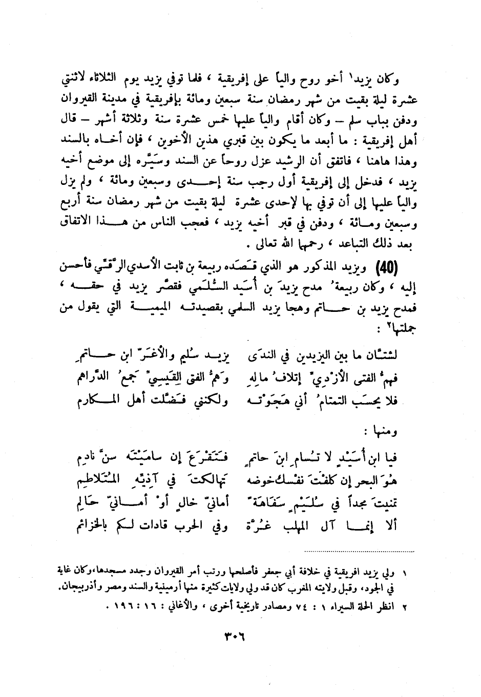 (40) ويزيد المذكور هو الذي قصده ربيعة بن ثابت الأسدي الرقي فأحسن إليه، وكان ربيعة مدح يزيد بن أسيد السلمي فقصر يزيد في حقه، فمدح يزيد بن حاتم وهجا يزيد السلمي بقصيدته الميمية التي يقول من جملتها (2) :