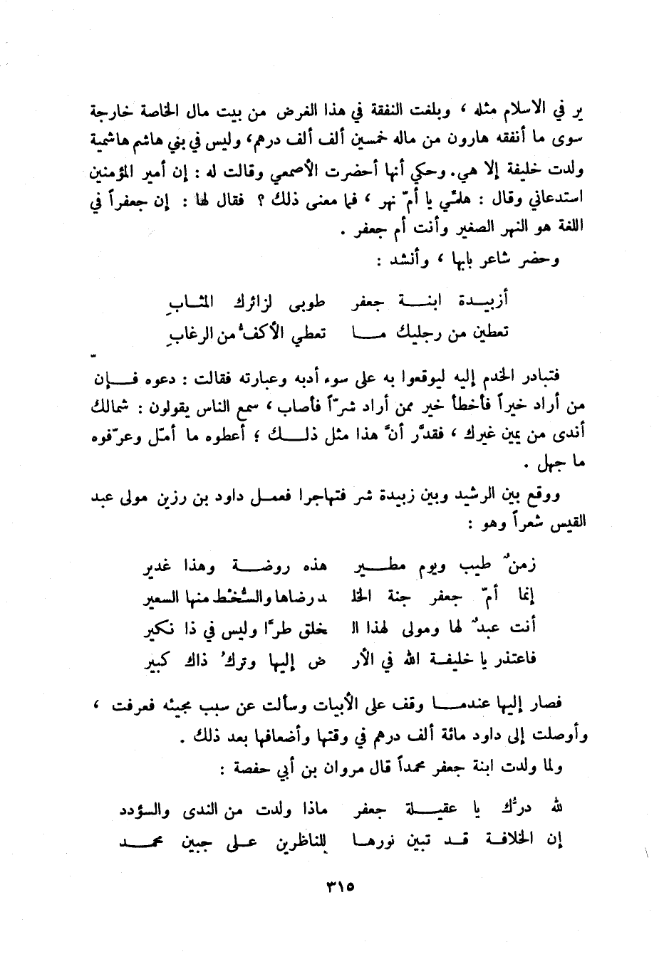 ير في الإسلام مثله، وبلغت النفقة في هذا الغرض من بيت مال الخاصة خارجة سوى ما أنفقه هارون من ماله خمسين ألف ألف درهم، وليس في بني هاشم هاشمية ولدت خليفة إلا هي. وحكي أنها أحضرت الأصمعي وقالت له: إن أمير المؤمنين استدعاني وقال: هلمي يا أم نهر، فما معنى ذلك فقال لها: إن جعفراً في اللغة هو النهر الصغير وأنت أم جعفر.