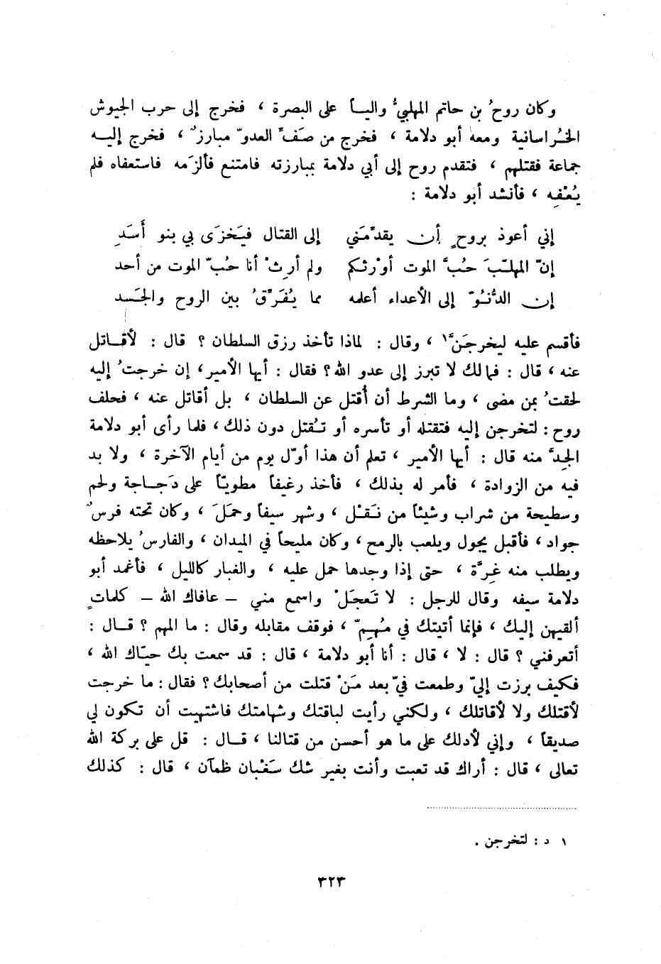 إن الدنو إلى الأعداء أعلمه ... مما يفرق بين الروح والجسد فأقسم عليه ليخرجن (1) ، وقال: لماذا تأخذ رزق السلطان قال: لأقاتل عنه، قال: فمالك لا تبرز إلى عدو الله فقال: أيها الأمير، إن خرجت إليه لحقت بمن مضى، وما الشرط أن أقتل عن السلطان، بل أقاتل عنه، فحلف روح: لتخرجن إليه فتقتله أو تأسره أو تقتل دون ذلك، فلما رأى أبو دلامة الجد منه قال: أيها الأمير، تعلم أن هذا أول يوم من أيام الآخرة، ولابد فيه من الزوادة، فأمر له بذلك، فأخذ رغيفاً مطوياً على دجاجة ولحم وسطيحة من شراب وشيئاً من نقل، وشهر سيفاً وحمل، وكان تحته فرس جواد، فأقبل يجول ويلعب بالرمح، وكان مليحاً في الميدان، والفارس يلاحظه ويطلب منه غرة، حتى إذا وجدها حمل عليه، والغبار كالليل، فأغمد أبو دلامة سيفه وقال للرجل: لا تعجل واسمع مني - عافاك الله - كلمات ألقيهن إليك، فإنما أتيتك في مهم، فوقف مقابله وقال: ما المهم قال: أتعرفني قال: لا، قال: أنا أبو دلامة، قال: قد سمعت بك حياك الله، فكيف برزت إلي وطمعت في بعد من قتلت من أصحابك فقال: ما خرجت لأقتلك ولا لأقاتلك، ولكني رأيت لباقتك وشهامتك فاشتهيت أن تكون لي صديقاً، وإني لأدلك على ما هو أحسن من قتالنا، قال: قل على بركة الله تعالى، قال: أراك قد تعبت وأنت بغير شك سغبان ظمآن، قال: كذلك